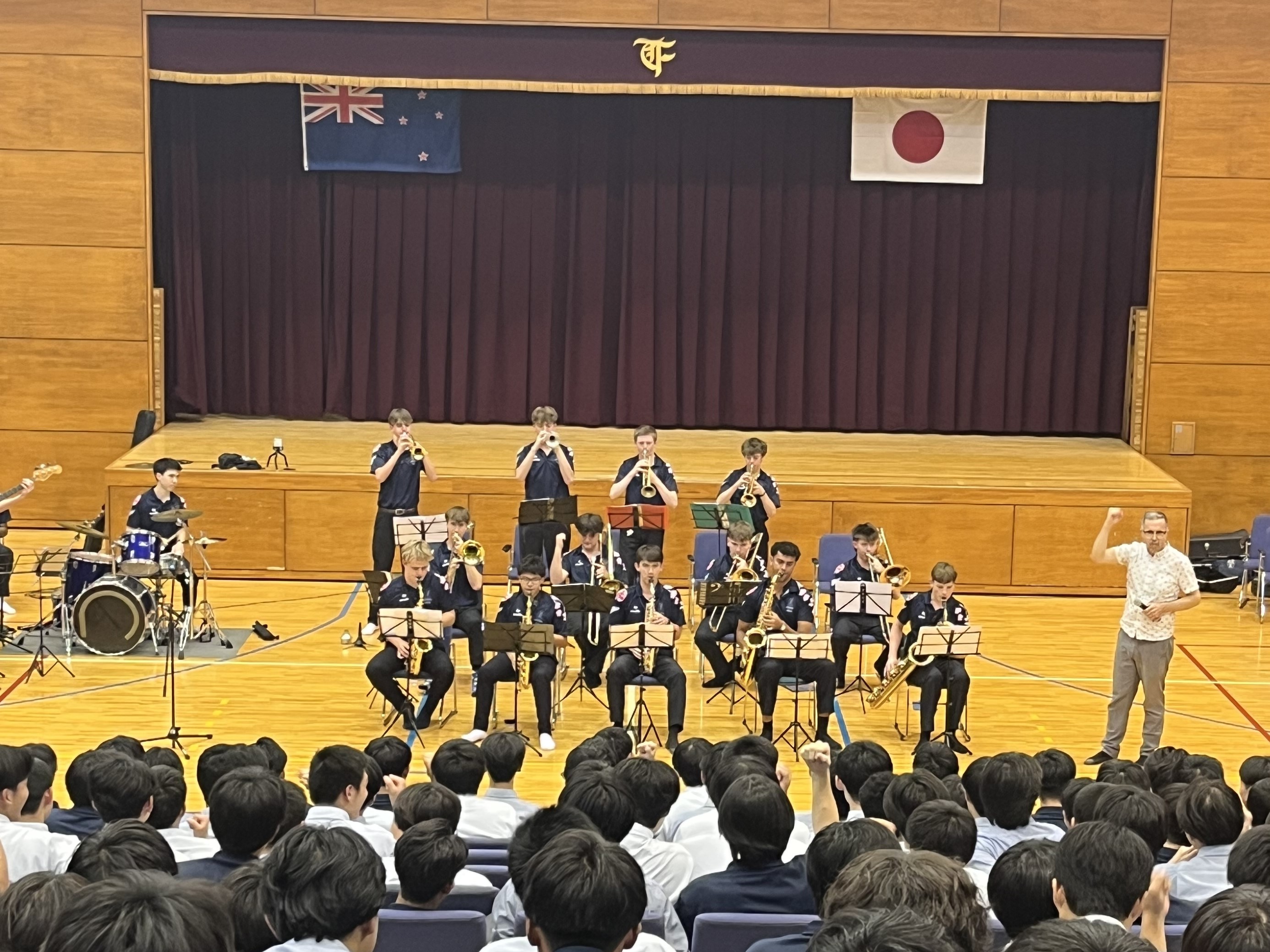 まずは和太鼓同好会による演奏で、日本の伝統芸能を堪能してもらいました。そして本校吹奏楽部による演奏に続き、タウランガのジャズバンドチームによる演奏が行われ、その後にはなんと藤嶺とタウランガの合同演奏が実現!恐らく藤嶺藤沢110年の歴史で初めてのことです。体育館は終始大盛り上がりでした。