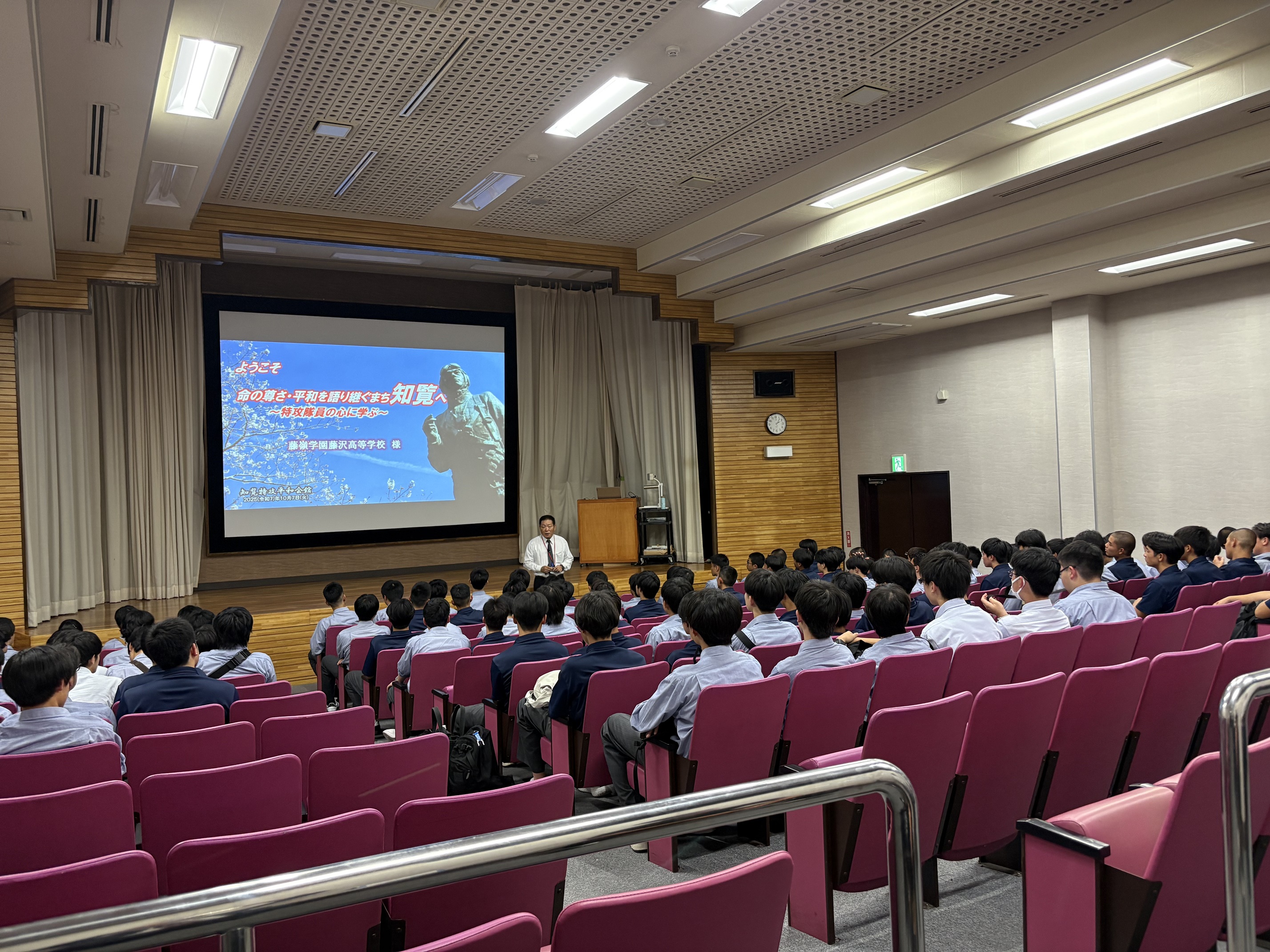展示を通して、生徒たちは自分たちと同じ10代後半で命を捧げた特攻隊員の姿に深い衝撃を受け、「自分だったらどう感じるだろう」「家族に何を伝えるだろう」といった問いを胸に、静かに展示を見つめる姿が印象的でした。語り部の方のお話からは、戦争の悲惨さだけでなく、平和の尊さ、命の重みについて考えるきっかけをいただきました。