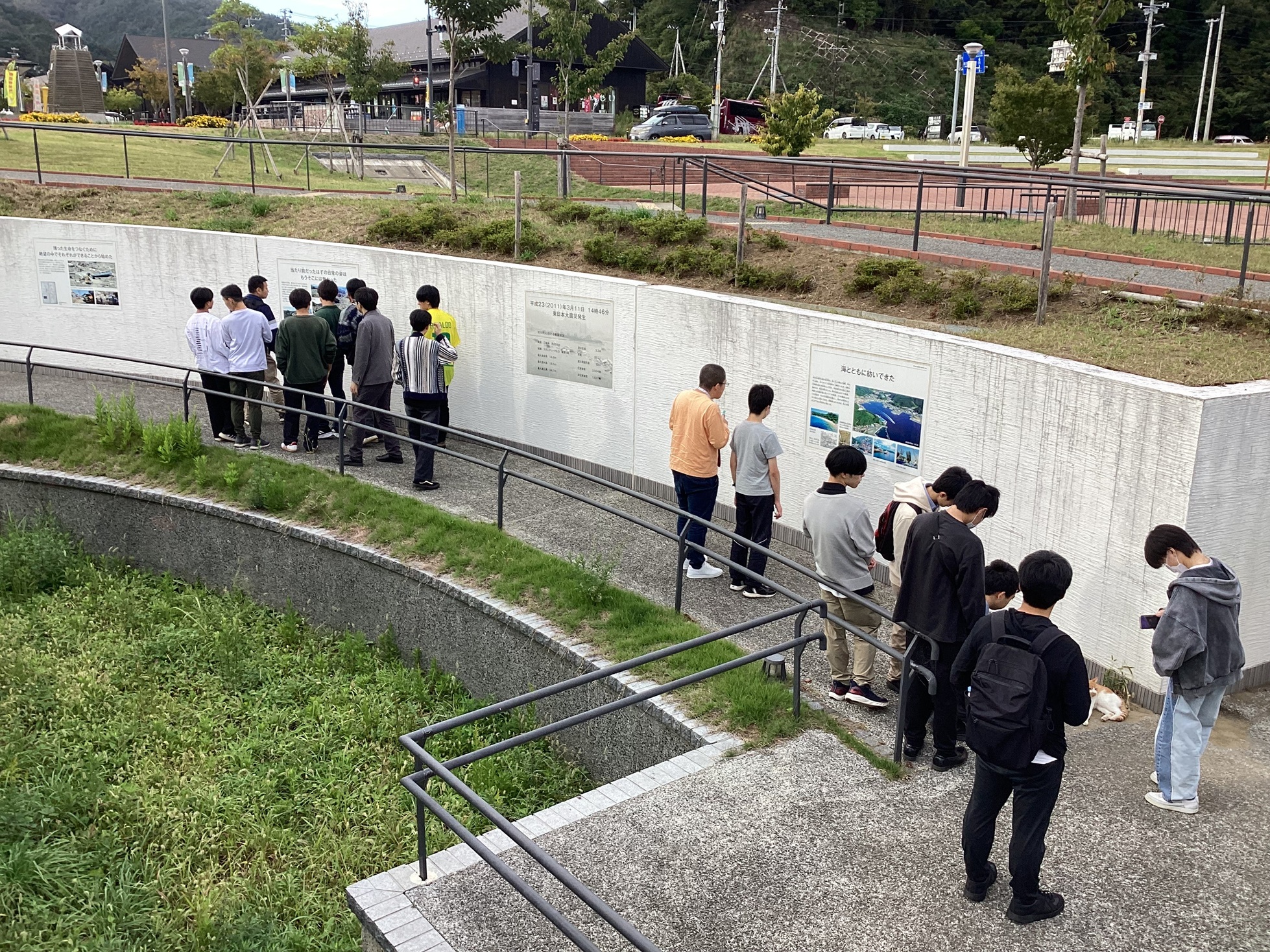 本日は朝早くから、南三陸町と女川町を訪問しました。午前8時にバスで出発後、バスガイドの方から、仙台東部道路が津波の防波堤となったことや、キリンビールのタンクが流されたという被害についてご説明いただきました。南三陸町に近づくにつれて、隆起した道路や津波の到達を示す印を目にし、震災の爪痕を実感いたしました。 午前10時、南三陸町に到着いたしました。最初に「南三陸町震災復興祈念公園」を訪れ、かさ上げされた土地に設けられた慰霊の場で、震災の記憶と復興への思いを感じ取ることができました。津波で被災し、鉄道がBRT(バス高速輸送システム)に転換された旧志津川駅の跡地も確認いたしました。 続いて「南三陸ポータルセンター」で語り部の方からお話を伺いました。神奈川県出身の語り部の方は、震災後のボランティア活動を通して地元の人に励まされ、移住して起業支援に携わるようになったご経験をお話しくださいました。その後、生徒たちは「南三陸さんさん商店街」で地元グルメを堪能いたしました。 午後は女川町へ移動し、「シーパルピア女川」を中心にフィールドワークを行いました。「防潮堤を作らないまちづくり」や「コンパクトシティ」構想について学び、津波の浸水想定区域を3段階に分けた土地利用の工夫を理解いたしました。中心市街地に商業施設を集約し、高台の住宅地と分けることで、賑わいと安全性を両立させていることを知りました。女川町の中学生が発案した「いのちの石碑」が、震災の教訓を未来に伝える役割を担っていることも学びました。 漁業復興においては、カタールから支援された巨大冷蔵庫「マスカー」の役割や、復興に向けた人々の尽力を知りました。震災遺構である旧女川交番も見学し、津波の破壊力を改めて感じました。ワークシートで学びを振り返った後、120分かけてホテルの帰路につきました。