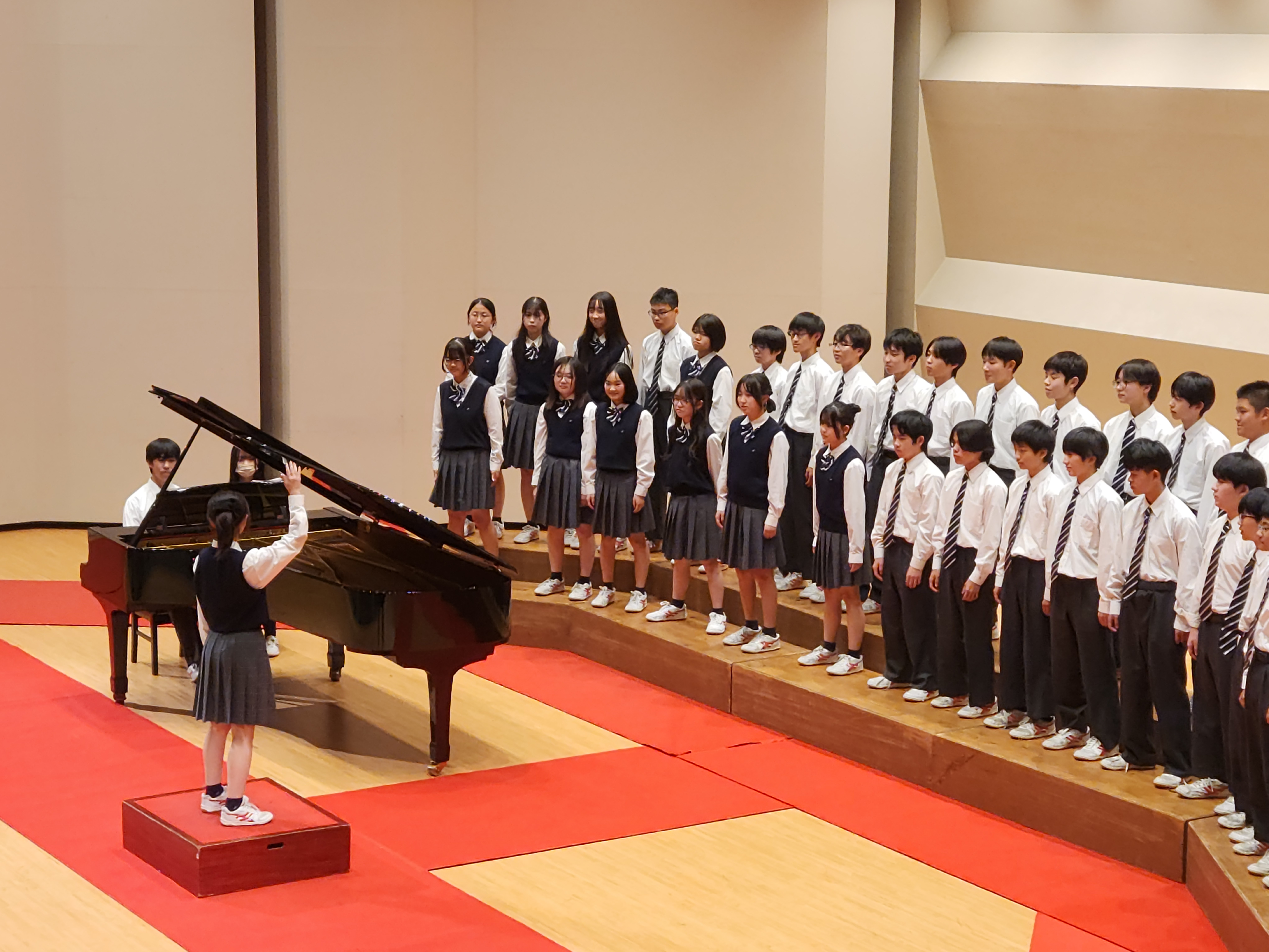 1学年部・2学年部は太祖降誕会奉讃合唱祭を開催しました。当日は多数の保護者の方にご来場いただきまして、誠にありがとうございました。生徒たちは音楽の授業や放課後の時間を使い、本番に向けてたくさんの練習を重ねてきました。本番当日、いつもと様相の違う講堂ステージでの発表は、生徒たちにとって緊張の場となったと思いますが、どのクラスも練習の成果を存分に発揮できました。合唱を通して心を1つにし、それが会場全体に伝わる、とても感動的な時間になりました。