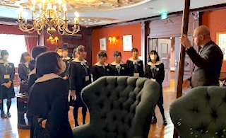 ホテルのチェックイン後にはマナーハウスツアーに出発!マナーハウスは「領主の館」という意味で、実際にイギリスで用いられていた木材を船で運び、現在の地で再度建てなおした建物だそうです。今日から3日間過ごす建物を散策し、Queen's Room や King's Room では、それぞれどういったところが違っているかを見つけながら移動しました。アンティークな調度品や内装、それらが持つ意味や歴史を学ぶことができました。階段に飾られたステンドグラスの重さをクイズにされ、一番重く考えた生徒で100kgと答えましたが、正解はなんと1000kgだそう。これには声をあげて驚いていました。