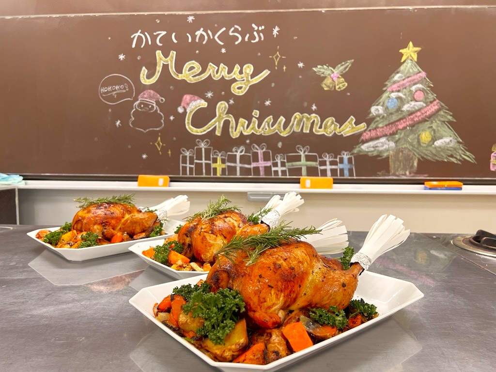 昨年12月、家庭科クラブでは冬休みの活動でクリスマス料理を作りました。今回は新たな挑戦として、以前から作っていた「ブッシュ・ド・ノエル」に加え、「丸鶏を使ったローストチキン」と「ホットワイン風葡萄ティー」を作りました。