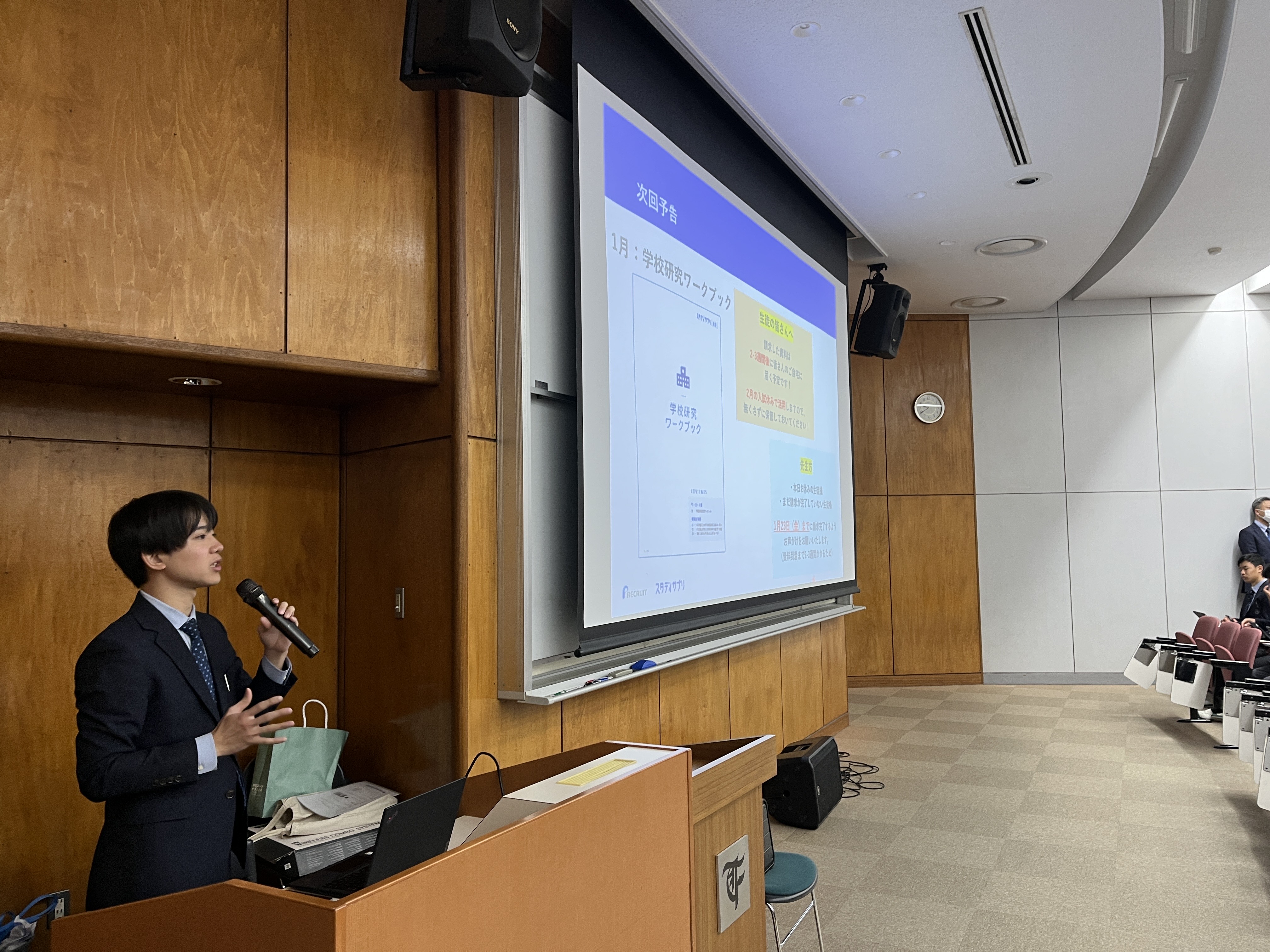 講演では、スタディサプリのサービスを利用して自ら大学を調べ、興味のある学校の資料を請求する方法について具体的に学びました。また、中高入試期間中に取り組む「学校研究ワークブック」を活用して、複数の大学を比較・検討するプログラムの紹介もありました。