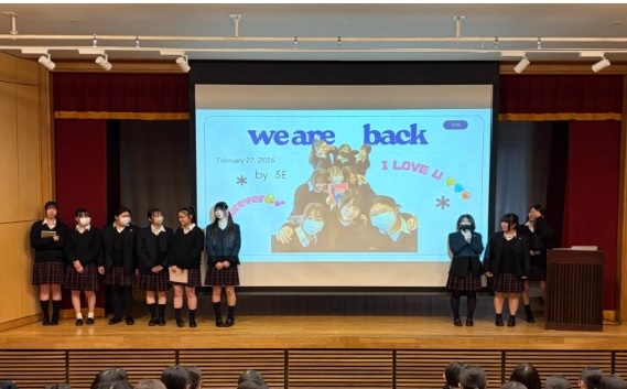 2月27日(金)に、5年生(高校2年生)は、学年全体で「国際コースお帰りなさい会」を行いました。