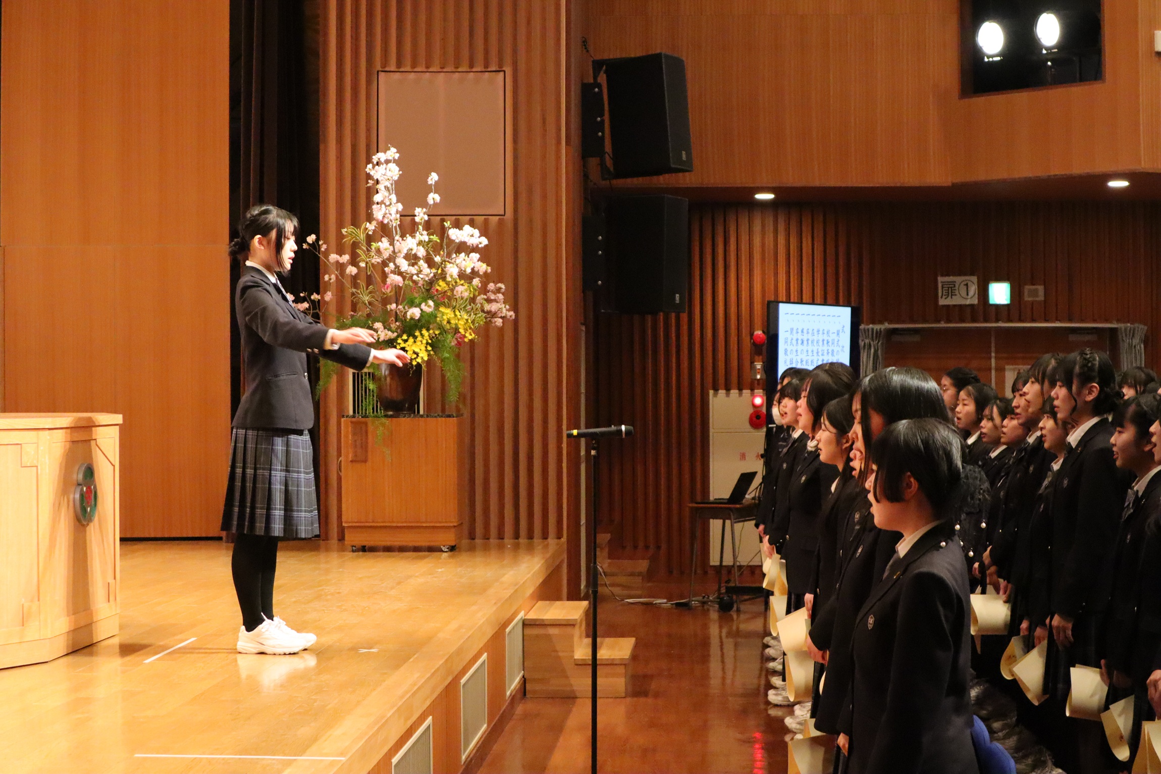 在校生送辞では、三輪田祭の時に演出・装飾で生徒全員をアドベンチャーの世界に誘ったり、運動会で下級生も円陣に誘ったり、学年を越えて一つのチームを創り上げた77回生への感謝の気持ちが述べられました。