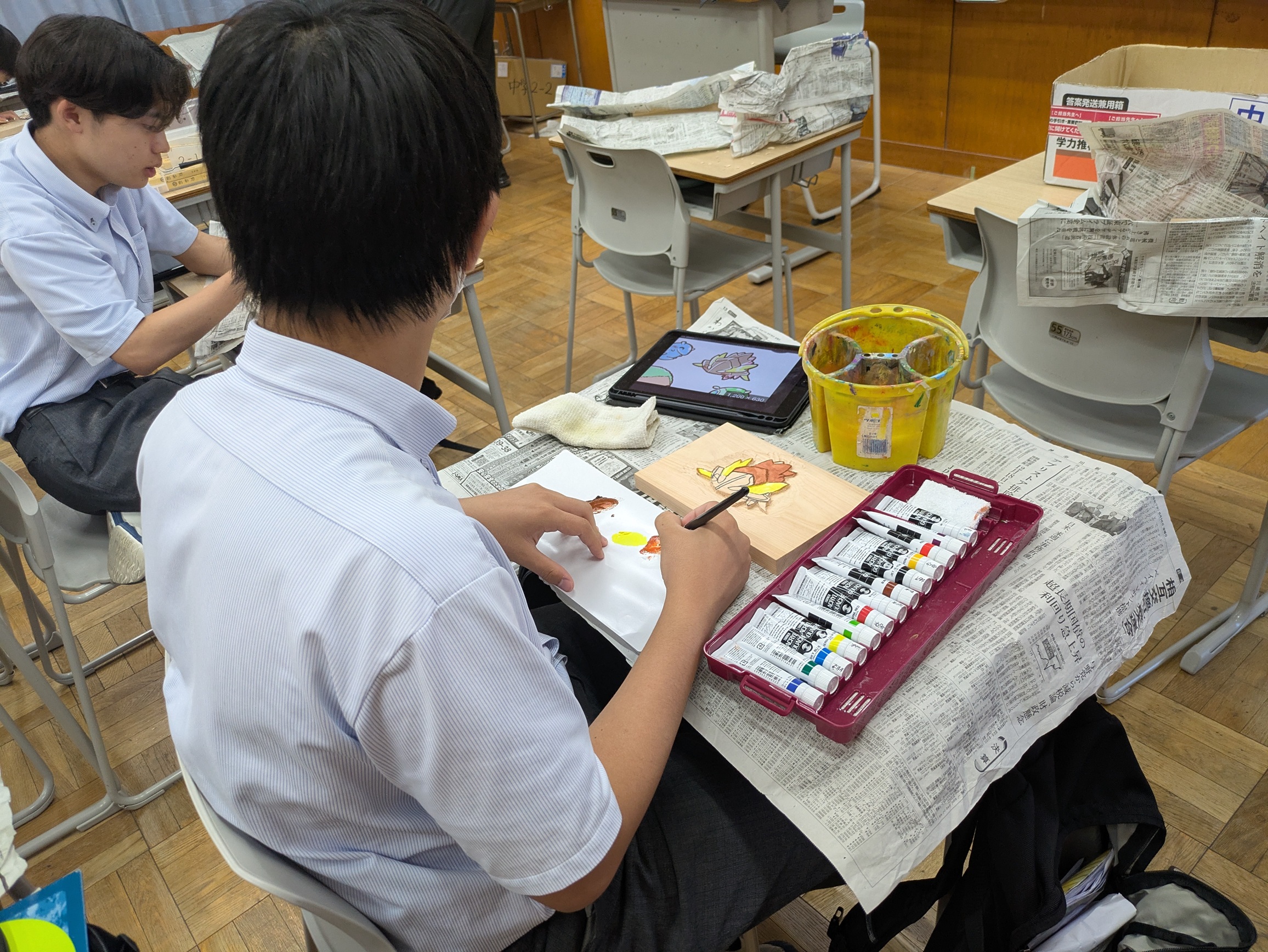 (講師からのコメント)今回の木彫り体験では、生徒たちが思い思いのイラストを木に描き、彫り上げる作業に楽しそうに取り組んでいました。ゲームやアニメのキャラクター、動物やペットなど、個性豊かなテーマが並び、どの作品にもその生徒らしさが表れていました。 初めての木彫りにもかかわらず、浮き彫りの技法を丁寧にこなし、時間が足りなかった生徒もいましたが、最後には絵の具で彩色して仕上げるなどして完成させていました。 ものづくりの面白さと達成感をしっかり味わってくれたようで、指導する側としても楽しい時間でした。