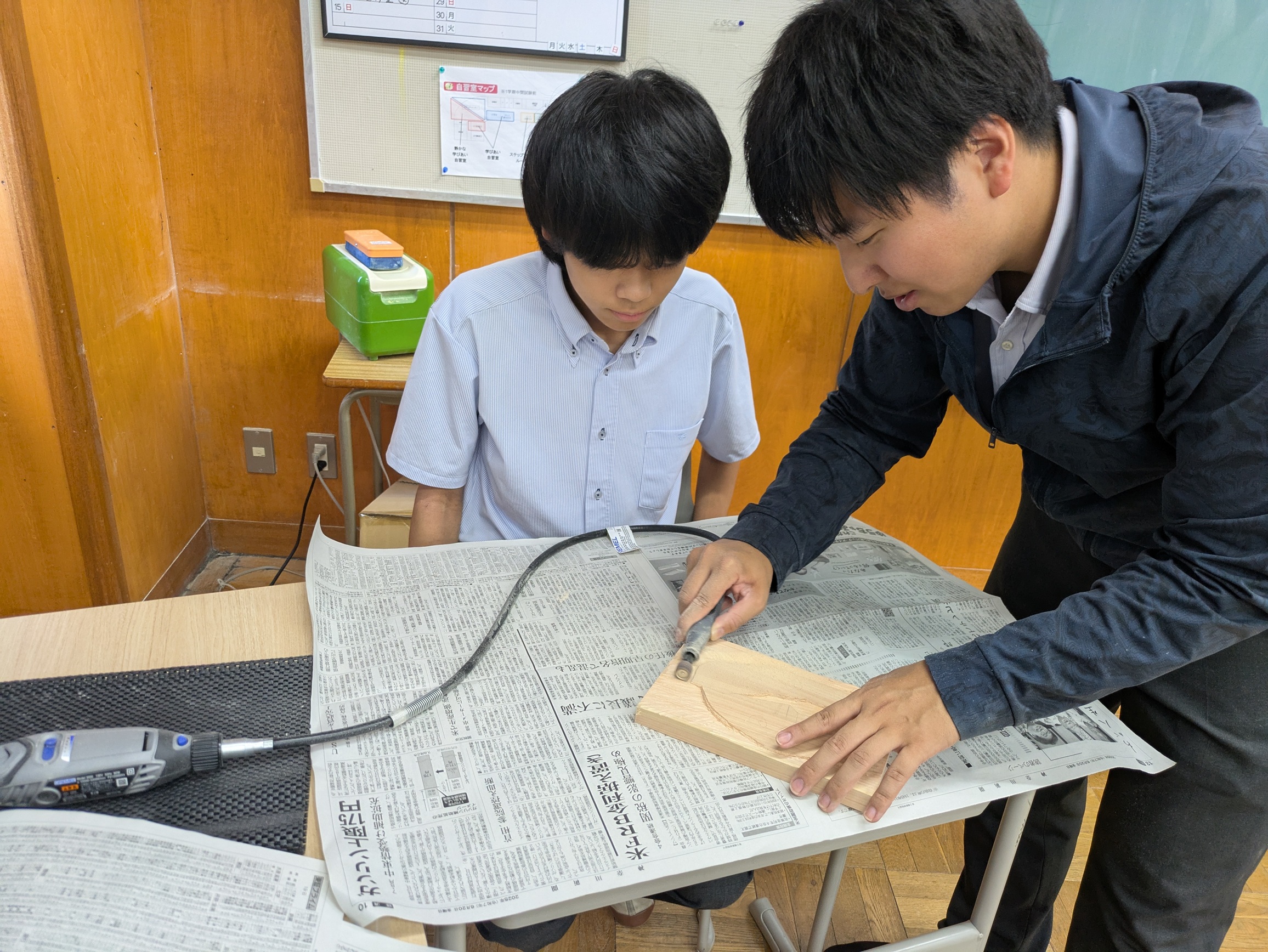 (遊行塾担当者より)授業より別格な集中力、やっぱり好きな物を作品にするのは、生徒は楽しそう。荒削りな表面も機械を使って磨いたり、早い生徒は色づけにも取り組み、とても楽しそうでした。
