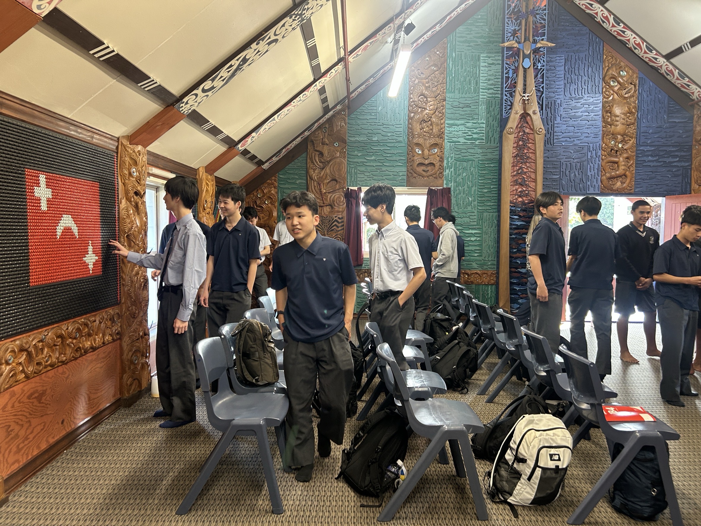 週末が明け、タウランガボーイズカレッジへの初の登校日でした。 1時間目は「Pōwhiri」という先住民であるマオリ式の儀式に参加させてもらい、現地の生徒たちがマオリの歌や踊りで歓迎してくれました。2時間目からはバディとなる現地の学生が藤嶺の生徒一人ひとりを迎えに来てくれ、ペアになり一緒に授業に参加しました。4時間目は、藤嶺生15名で英会話の授業です。生徒も頑張って英語で話します。お昼はバディが迎えに来てくれ、現地の生徒と一緒に昼食をとりました。午後の授業もバディと一緒に過ごし、終業後にはファミリーの待つ家に帰っていきました。緊張の初登校日、生徒たちはバディとの英語でのコミュニケーションの難しさを実感しつつも、日本との違いを楽しんだ様子です。