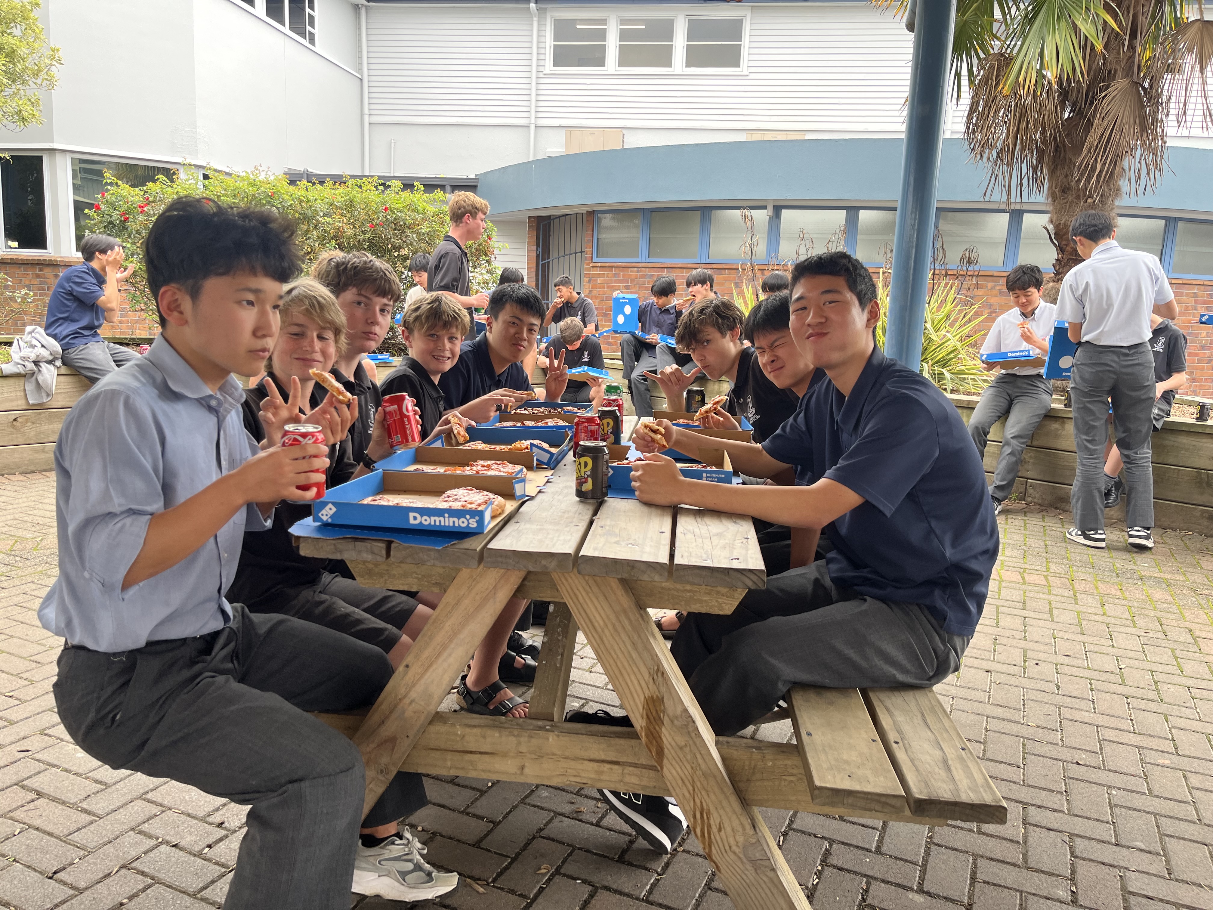 今日はTBCへの最終登校日でした。早いもので、2週間一緒に過ごしたバディとは今日でお別れです。 4時間目の英会話の時間には、バディも参加して修了式とお別れ会が行われ、本校代表生徒のスピーチと校歌を披露しました。さらに今回は、生徒一人ひとりがバディに向けて、英語でスピーチをしましたが、心からの感謝が真摯に伝わるものでした。言葉の壁を超えて、想いが通じあった素敵な時間となりました。また、数名のバディからもスピーチがあり、感動的な雰囲気と温かい言葉に、少しうるっときている生徒もいました。この2週間で、まさに心に触れる体験が出来ていた証拠です。感動的な修了式とお別れ会の後は、バディと一緒にピザを囲ってパーティーを楽しみました。