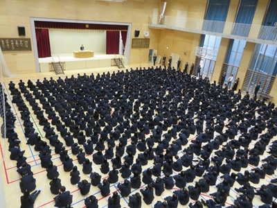 4月8日(水)、新入生を加えた全生徒が第1アリーナに集い、前期始業式と、新たにお世話になる先生方の着任式を行いました。新入生は新しい学校に緊張しながら、2・3年生は新しいクラスに胸を躍らせながら登校していました。