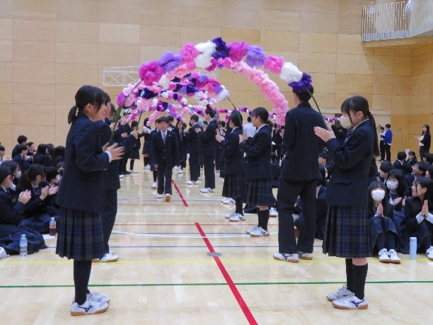 最初は華やかな花のアーチで初々しい新入生を迎え入れる入場シーンからスタート。その後は、先輩たちによる部活動や委員会紹介を始め、学年混合の班に分かれ、クイズを通して学校生活の過ごし方を学んだり、校内各所にまつわるクイズに挑戦したりしました。