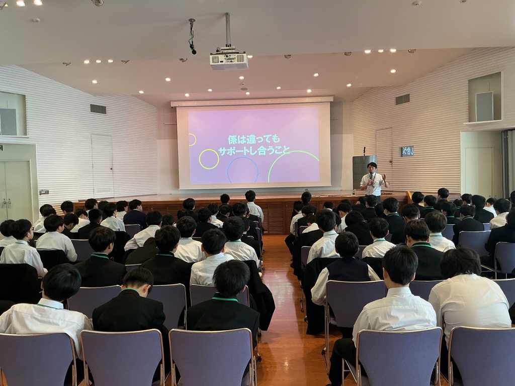 校長・副校長・生徒指導部長による講話が行われ、新入生の皆さんは落ち着いた姿勢で真剣に耳を傾けていました。講話を通して、学校生活において大切にしてほしい考え方や、人と人との関わりの重要性について学びました。また、生徒指導部長からは「他者との関係」について、情報処理部からは「デジタル・シティズンシップ」についての説明があり、安心・安全な学校生活の基盤となる「他者の人権を尊重する姿勢」について考える機会となりました。