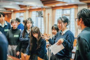 2年生は「職業体験」。依頼電話から訪問、発表まですべてを一人で行う、生徒が大きく成長するプログラムです。3年生では「長崎研修」を通して「平和学習、キリシタンの歴史そして課題解決学習」を行います。高校生になるとより視野を広げ、SDGs(持続可能な開発目標)をターゲットに、探究的な学びを深めます。