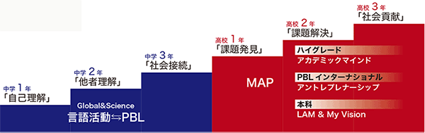 中1で「自己理解」、中2で「他者理解」、中3で「社会接続」を軸に探究的学びを深めて、高1の「課題発見」、高2の「課題解決」、高3の「社会貢献」へと続きます。