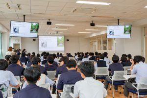 発表会は7月11日に実施。中高協力しての発表に真剣に耳を傾ける中3生。ちなみに、中2の国語で学ぶ『平家物語』の那須与一ゆかりの地も近くにあることから、芭蕉や『おくのほそ道』のほか那須与一について学び発表したグループも。