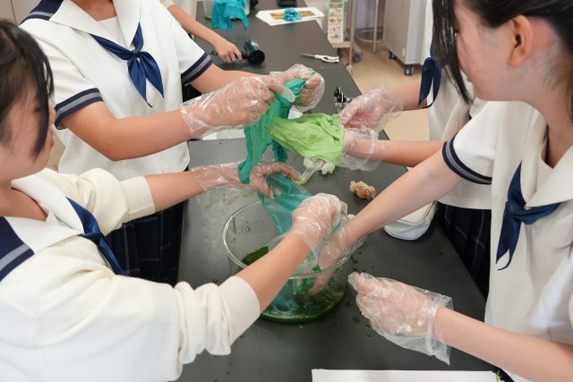 中学2年生は、理科と技術の教科横断型授業として「ジャパンブルーへの挑戦 ~藍染めプロジェクト~」に取り組みました。藍染め職人の方からアドバイスをいただきながら、畑づくりから藍の栽培、そして染色に至るまで、すべての工程を自分たちで行いました。日常ではなかなか触れることのない科学と日本の伝統文化にふれることができました。