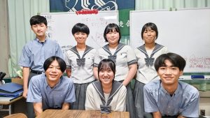 中高合同の生徒会室で。生徒会は立候補制。立会演説会にはそれぞれが公約を掲げて臨むそう。(前列左から)I・Uさん(副会長/中2)、I・Aさん(生徒会長/中3)、N・Yさん(副会長/中3)、(後列左から)T・Hさん(書記/中2)、K・Aさん(会計/中3)、M・Yさん(議長/中3)、S・Sさん(書記/中3)。