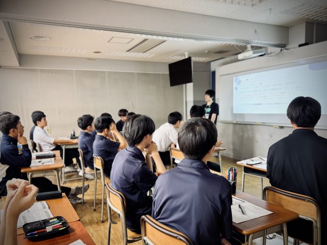 毎年、恒例の「OBのお話を聴く会」。今回は20代から40代前半の13名のOBが母校に集いました。高1生たちは、医師、国家公務員、弁護士、報道マン、ベーシストなどの、さまざまな職種の中から2名の先輩を選びます。仕事や大学受験の体験談などを聴く中で、高2からの文理選択を視野に入れながら、将来像を描けた生徒もいたようです。