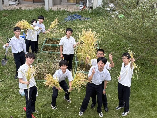 中学2年生と高校1年生の部員が、学校の敷地内で育ててきたイネをこの秋ついに収穫しました。春先に苗を植えてから、草取りや水やりなど慣れない作業に戸惑いながらも、部員同士で協力し合い、試行錯誤を重ねてきました。収穫したイネは1週間ほど天日で干したのち精米し、みんなで炊き立ての新米を味わい、喜びと達成感を分かち合いました。