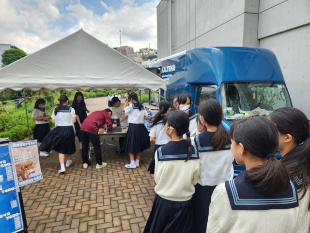 大妻中野では今年からお試しで週1、2回キッチンカーによるランチ販売を導入しています。1学期は高校生だけでしたが、2学期は中学生にも広げ、学年ごとに順番で購入できるようにしています。アサイーボウルをはじめ人気メニューには長い列ができるほど。仲間が集まって過ごすランチタイム。妻中生の楽しみがまた一つ増えました。