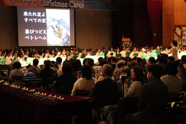 少し気が早いですが、聖園の丘には9月ごろからクリスマスキャロルが響きはじめます。ミサからはじまるクリスマス行事を締めくくるのは、中2・高2有志生徒による聖書の朗読劇と、中1・中3・高1生・聖歌隊ハンドベルクワイアによるキャロル演奏。慌ただしく過ぎていった日々に思いを寄せつつ、聖園生と教職員が愛と平和への祈りを共にする時間は特別なものです。