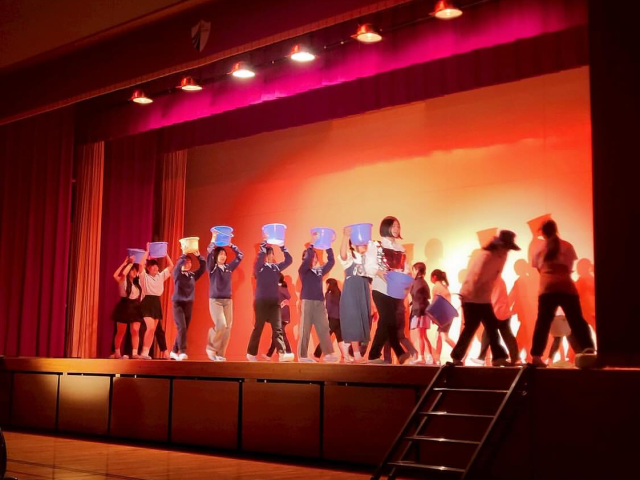 中学1・2年生では、「英語で自分を表現する」ことを目標に英語のミュージカルを発表する、イングリッシュエクスプレスという授業があります。英語芸術学校マーブルズのプロ講師による指導のもと、英語の歌やセリフを覚え、さらにダンスも踊り、仲間と共に年に2回発表会を行います。語学力だけでなく、表現力や協調性なども育まれる授業です。