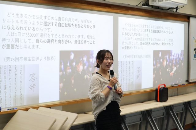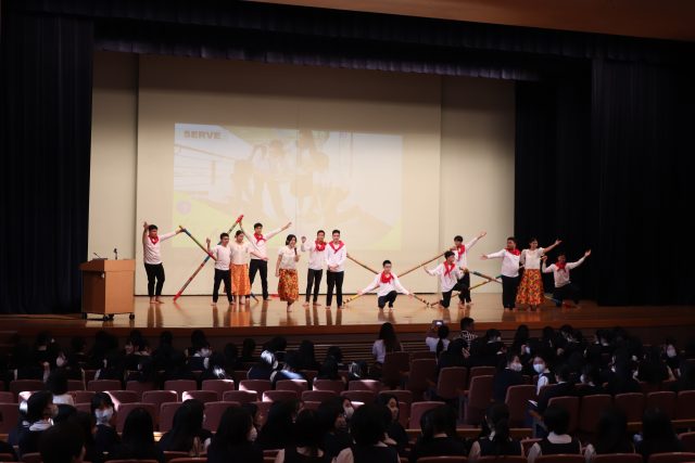 この夏、清泉生が留学したセブ島にあるカトリックの共学校(SHS)から、交換留学の女子生徒が来校。セブ島で9月末に大地震があったなか、来日できたことを喜び合いました。半月の滞在期間中には、茶道や鎌倉探索などを体験。また、同時期に栄光学園に留学中の男子生徒と一緒にフィリピンの文化を紹介。講堂は大きな拍手に包まれました。