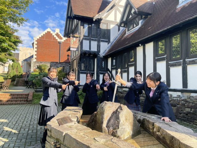中学2年生はブリティッシュヒルズ研修に行ってきました。日本にいながらイギリスに留学したような雰囲気で学ぶことができる「ブリティッシュヒルズ」での、英語漬けの3日間です。最初に英語での「入国審査」が行われ、授業もプレゼンもどんどん行います。一方でマナーハウスでのディナーや英国風の街並みの散策など、楽しみながら異文化にも触れました。