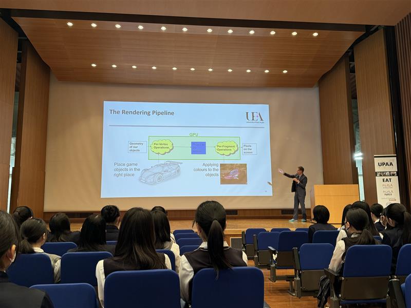 今回UPAAの協定校の一つであるEast Anglia大学のLaycock教授が来日され、高1、高2のSuper Englishクラスの英語の授業で、Computer Scienceの講義をしていただきました。