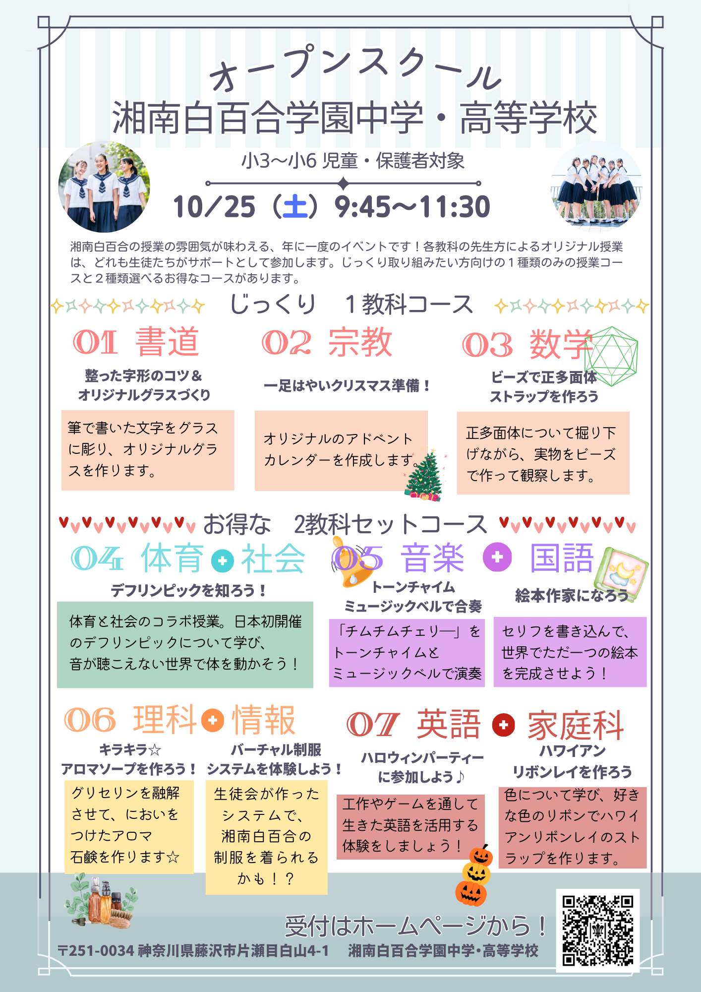 本校の教育や雰囲気を肌で感じていただける「第2回オープンスクール」を、10/25(土)9:45~11:30に開催します。