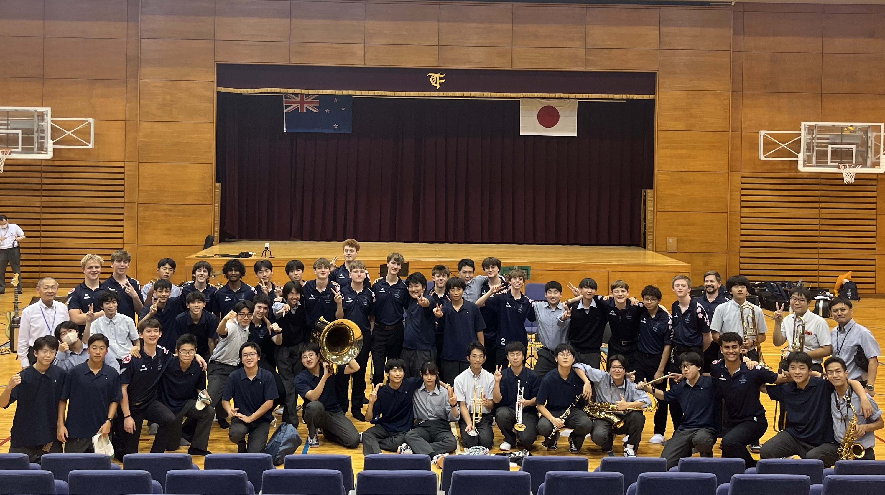まずは和太鼓同好会による演奏で、日本の伝統芸能を堪能してもらいました。そして本校吹奏楽部による演奏に続き、タウランガのジャズバンドチームによる演奏が行われ、その後にはなんと藤嶺とタウランガの合同演奏が実現!恐らく藤嶺藤沢110年の歴史で初めてのことです。体育館は終始大盛り上がりでした。
