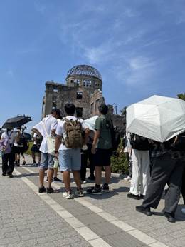 二日目は、広島平和記念資料館を見学しました。その後、被爆遺構、戦跡巡りをしました。被団協のガイドを担ってくださった方は、暑い中でも中高生に伝えたい、見せたいという思いでたくさんの場所へ連れて行ってくださいました。