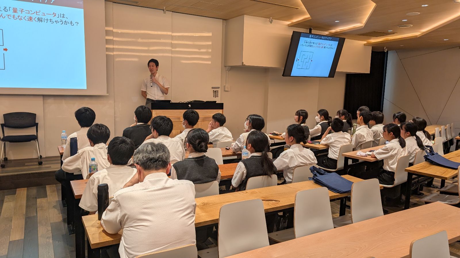 続いて、未来のコンピューターとして注目される「量子コンピューター」について紹介がありました。難解に思えるテーマでしたが、中学生にもイメージしやすい例を交えながら、わかりやすく解説してくださいました。その後の質疑応答では、一人ひとりの質問に丁寧に答えてくださり、生徒たちは研究者の考え方や姿勢に直接触れることができました。