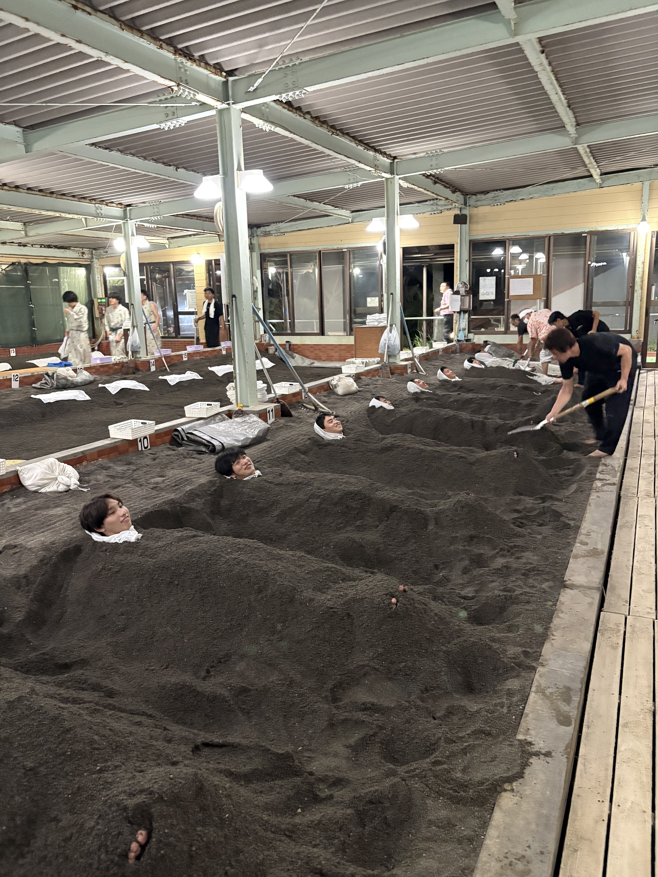 一日の締めくくりには、指宿名物の砂蒸し風呂を体験。最初は照れながらも、温かな砂に包まれると自然と笑顔がこぼれ、旅の疲れを癒しながら仲間との語らいも弾み、心身ともにリフレッシュできるひとときとなりました。「また入りたい!」という声も上がるほど、非日常の体験を楽しむことができました。