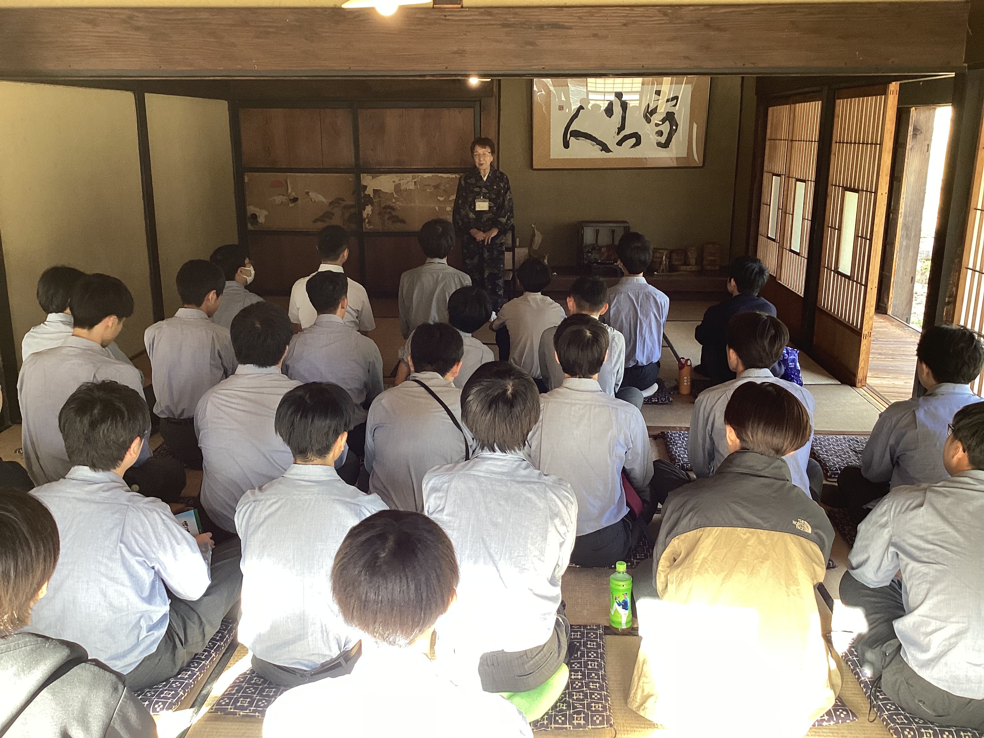 14時20分に到着するとスタッフが笑顔で出迎え、案内で「大工どん」の施設などを見学しました。スタッフの千葉さんは「この建物は江戸末期から明治初期に建てられたものです。以前はまっすぐの建物でしたが、馬を飼うのが流行し馬小屋を増設してL字型になりました」と説明しました。大工どんでは、菊地さんの昔話を聞きました。「昔は今のようにスマホや娯楽がなく、母が子どもに昔話を聞かせていました。」その後、おしらさまやかっぱ、座敷わらし、貧乏神などの妖怪の話を岩手弁で語り、最後は「どんどばれ」と締めくくられました。その後は敷地内を自由に散策し、カッパなどのオブジェが飾られた自然豊かな環境と澄んだ空気に心が癒やされました。 出発の際、スタッフはバスが見えなくなるまで手を振ってくれました。再び約90分のバス移動で、途中の道の駅に立ち寄りながら、研修旅行の醍醐味ともいえる宿泊施設へ向かいました。朝からの長旅で、車内では疲れて眠る生徒の姿も見られました。