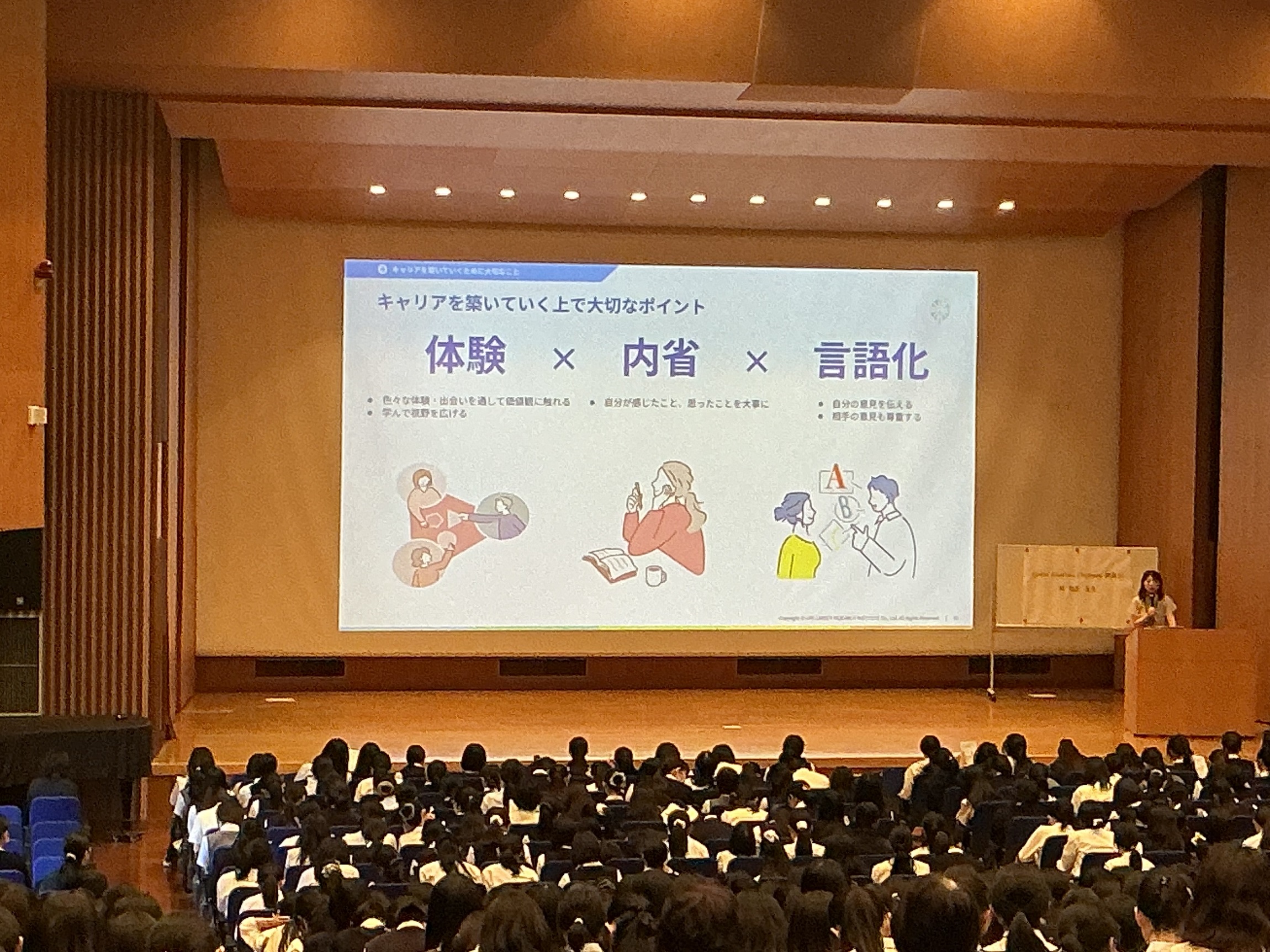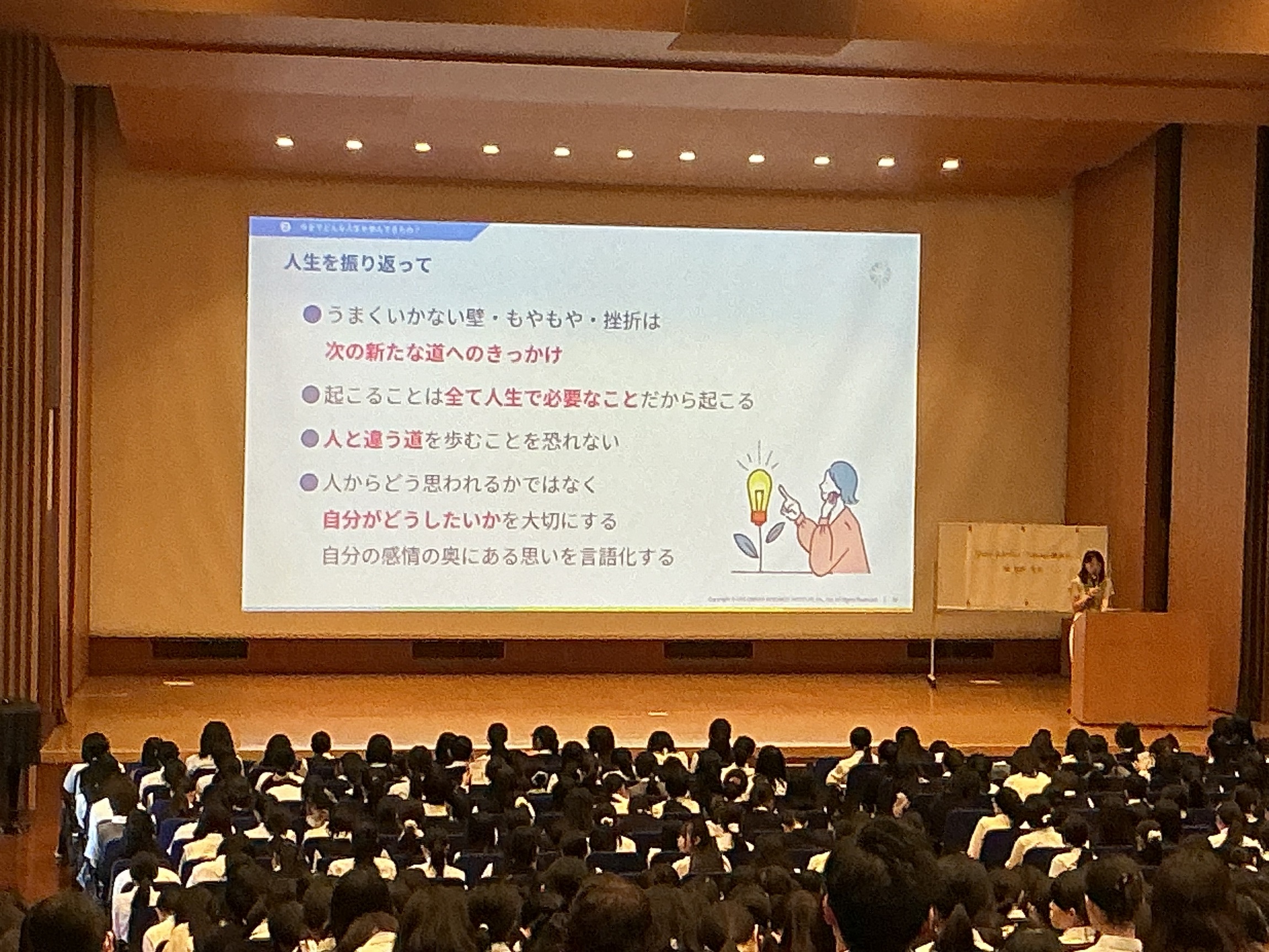 講演の後半は女性とキャリアをテーマに、ジェンダーギャップ指数が世界118位で、政治・経済面で指導的地位に就く女性が少ない日本の現状や、いまだに性別的役割分担の大きい日本の問題点についてのお話でした。少しずつではありますが、現状が変わりつつあることもふまえ、生徒たちが社会の第一線で活躍するころには、男女問わず、個人の能力・可能性を十二分に発揮できる社会であってほしいと思います。