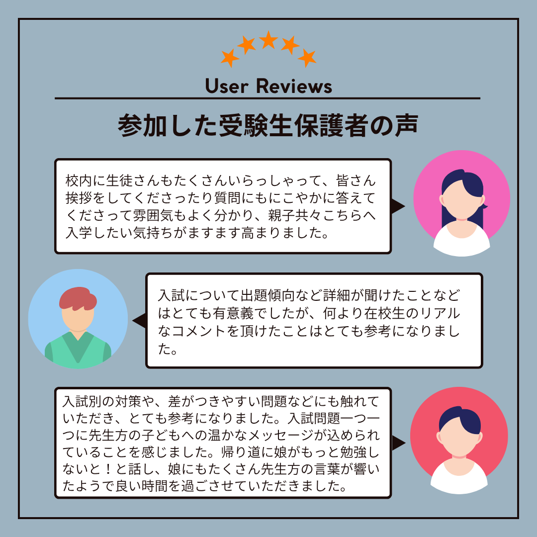 6年生はもちろん、5年生以下の方にとっても、受験に向けてどのような点を日頃の学習で留意したらよいか、親子でお聞きいただける機会になります。さらに、校内の施設を見学したり、先生や生徒に個別の相談をしたりもできます。