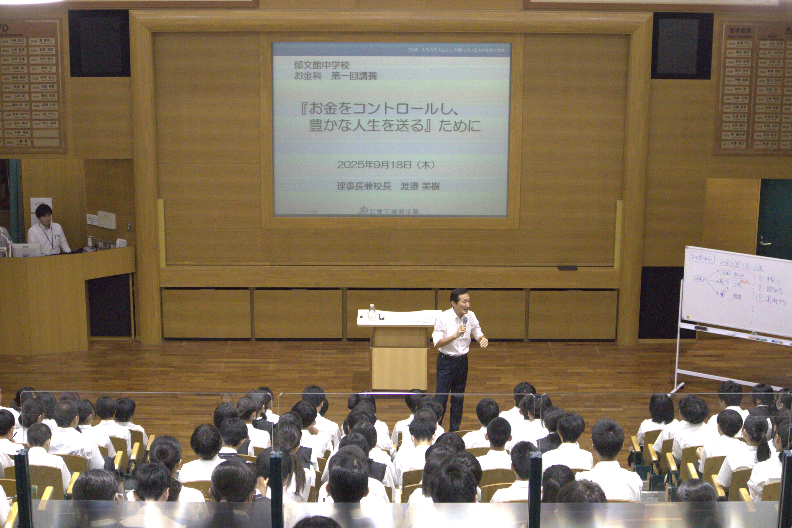 渡邉理事長による「お金科」の特別授業が、中学1年生全クラスを対象に行われました。