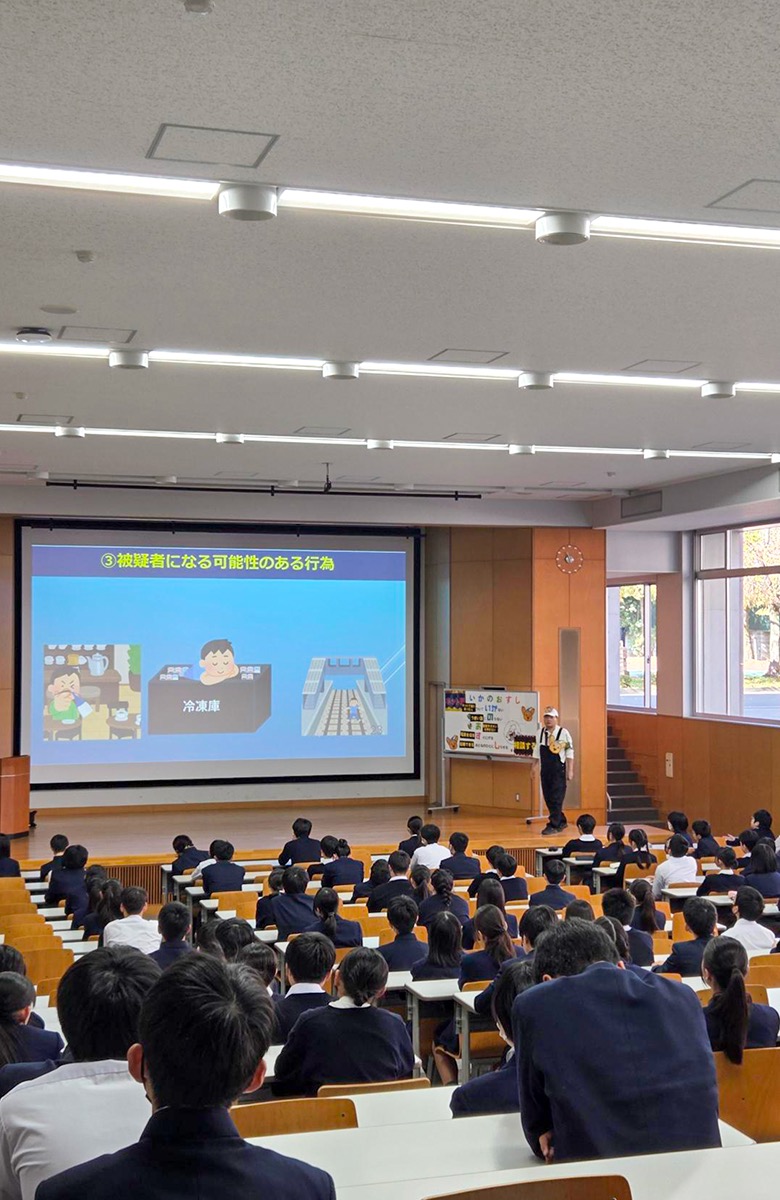 また、本校の卒業生である現役警察官も来校し、事件、事故に巻き込まれた際に悲しむのはいつも見守ってくれている保護者であることを認識し、日ごろの行動を気を付けるようにとアドバイスを頂戴しました。府中警察のスクールサポーター、生活安全課の巡査部長、本校の卒業生と大変お世話になりました。