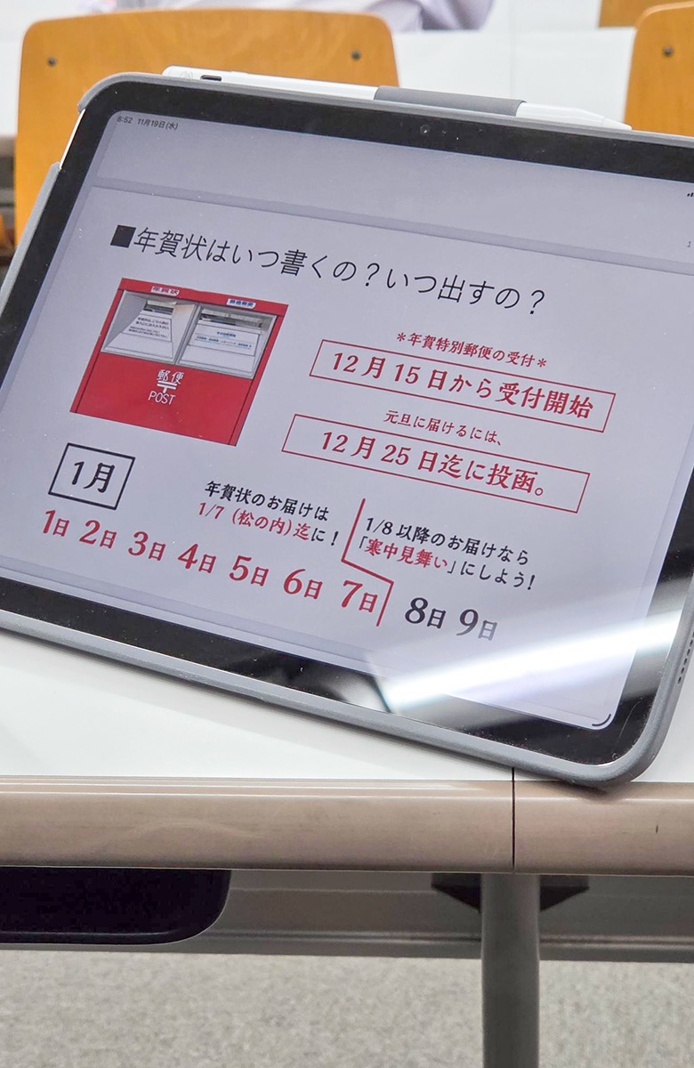 11月19日(水)本校視聴覚ホールにて、日本郵便株式会社の協力のもと手紙の書き方体験授業を実施いたしました。普段あまり書かなくなった手紙を使って、自分の気持ちを伝えることの大切さや、年賀状の歴史や書き方を丁寧にご説明いただきました。生徒達も保護者、友人宛に手紙にすることで、普段伝えられない想いを手紙にしたためておりました。日本郵便株式会社の皆様、JPPFC(JPペンフレンドクラブ)の皆様ご協力頂きありがとうございます。