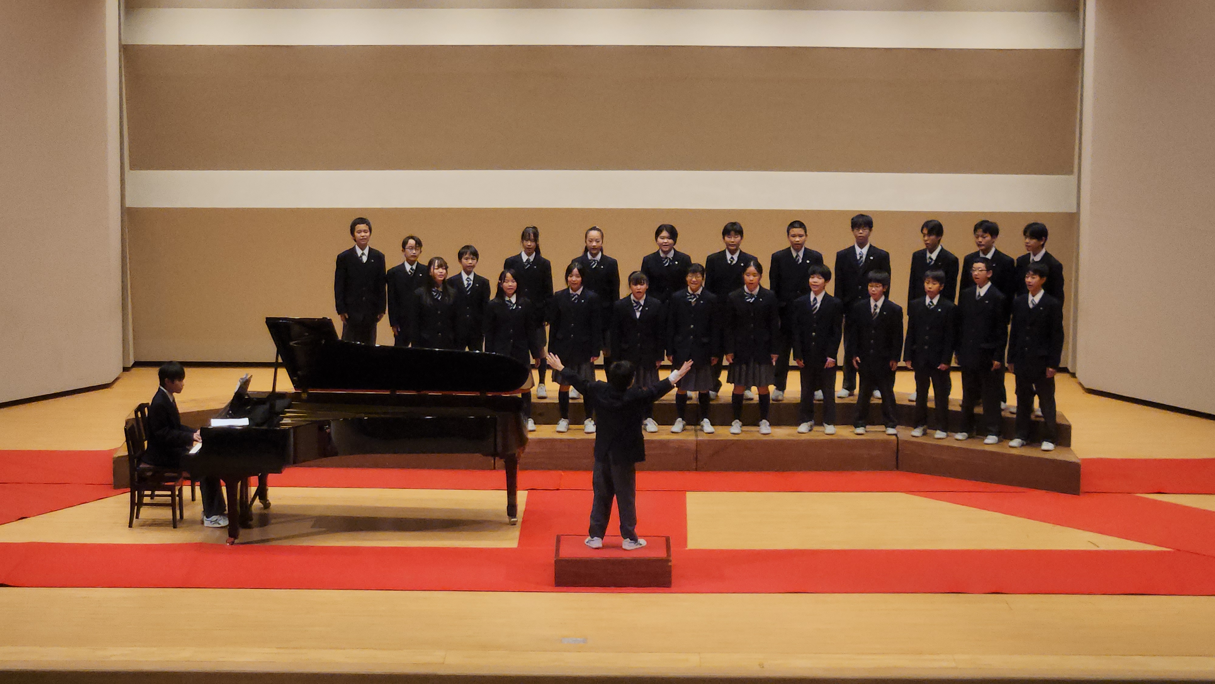 1学年部・2学年部は太祖降誕会奉讃合唱祭を開催しました。当日は多数の保護者の方にご来場いただきまして、誠にありがとうございました。生徒たちは音楽の授業や放課後の時間を使い、本番に向けてたくさんの練習を重ねてきました。本番当日、いつもと様相の違う講堂ステージでの発表は、生徒たちにとって緊張の場となったと思いますが、どのクラスも練習の成果を存分に発揮できました。合唱を通して心を1つにし、それが会場全体に伝わる、とても感動的な時間になりました。
