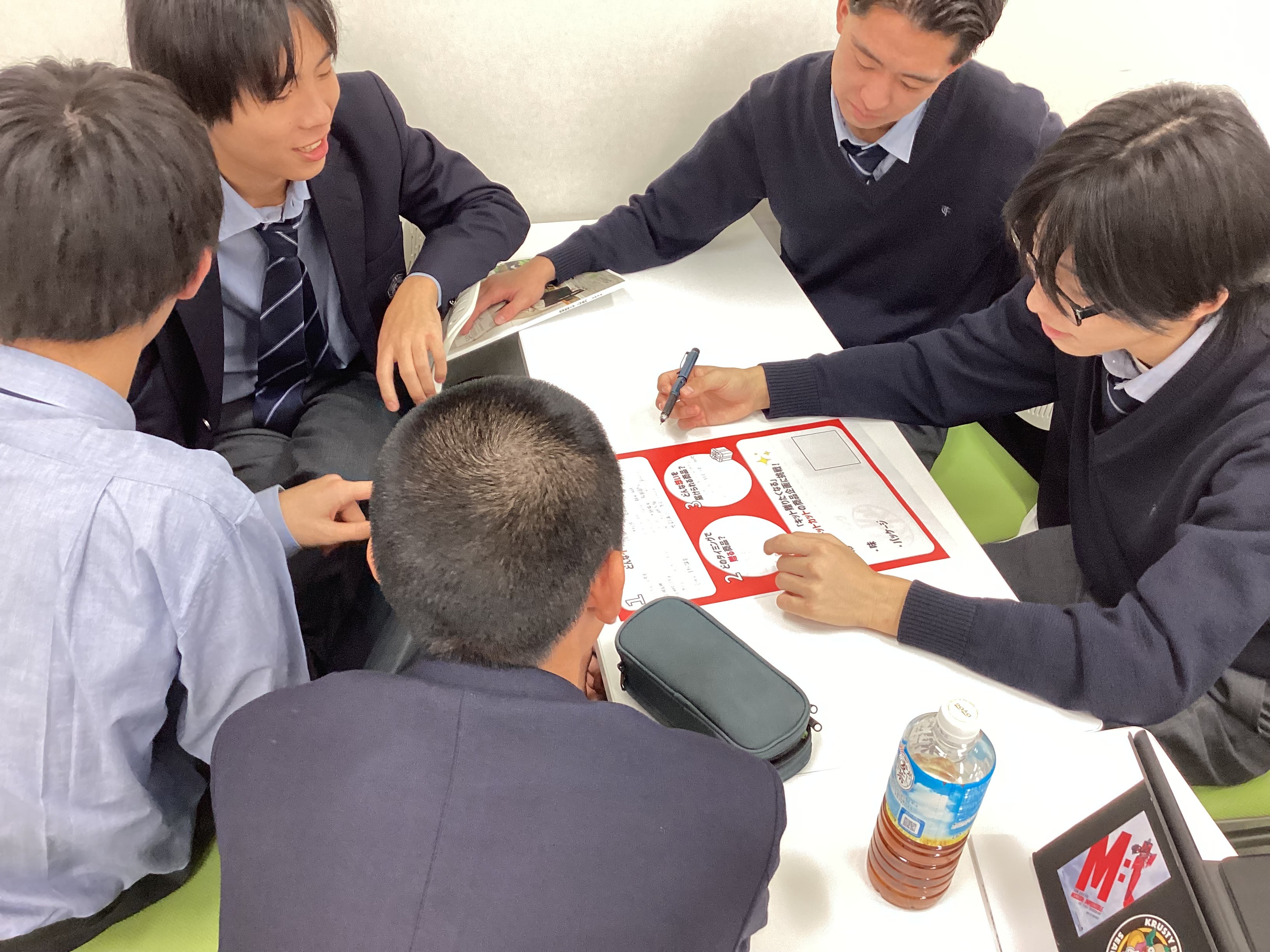 その後、本校の卒業生OB3名も参加して、「産業能率大学」の良さを等身大の言葉で話してくれました。昼食休憩を挟み、午後は、実際に大学の講義で行われている企画のデモ版「キットカットの販促キャンペーンコンペ」を行いました。2つのグループに分かれて、高校生の発想・感覚の企画をプレゼンしました。