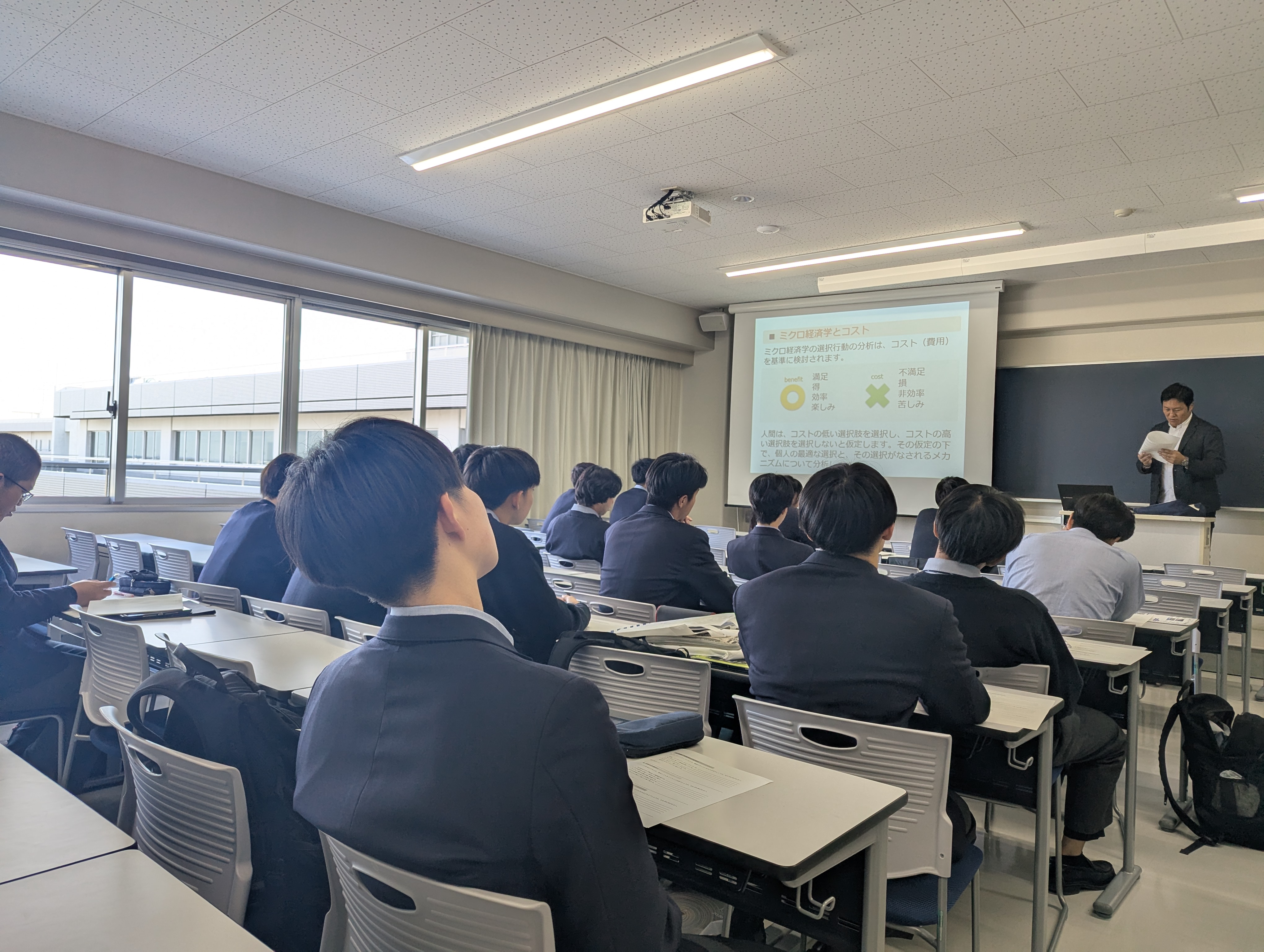 その後、「コストを理解すれば、経済学が見えてくる」というテーマの経済学講義にも参加し、大学ならではの専門的な学びに触れる貴重な機会となりました。高校の授業とは異なる視点や内容に、生徒たちは大きな刺激を受けていました。