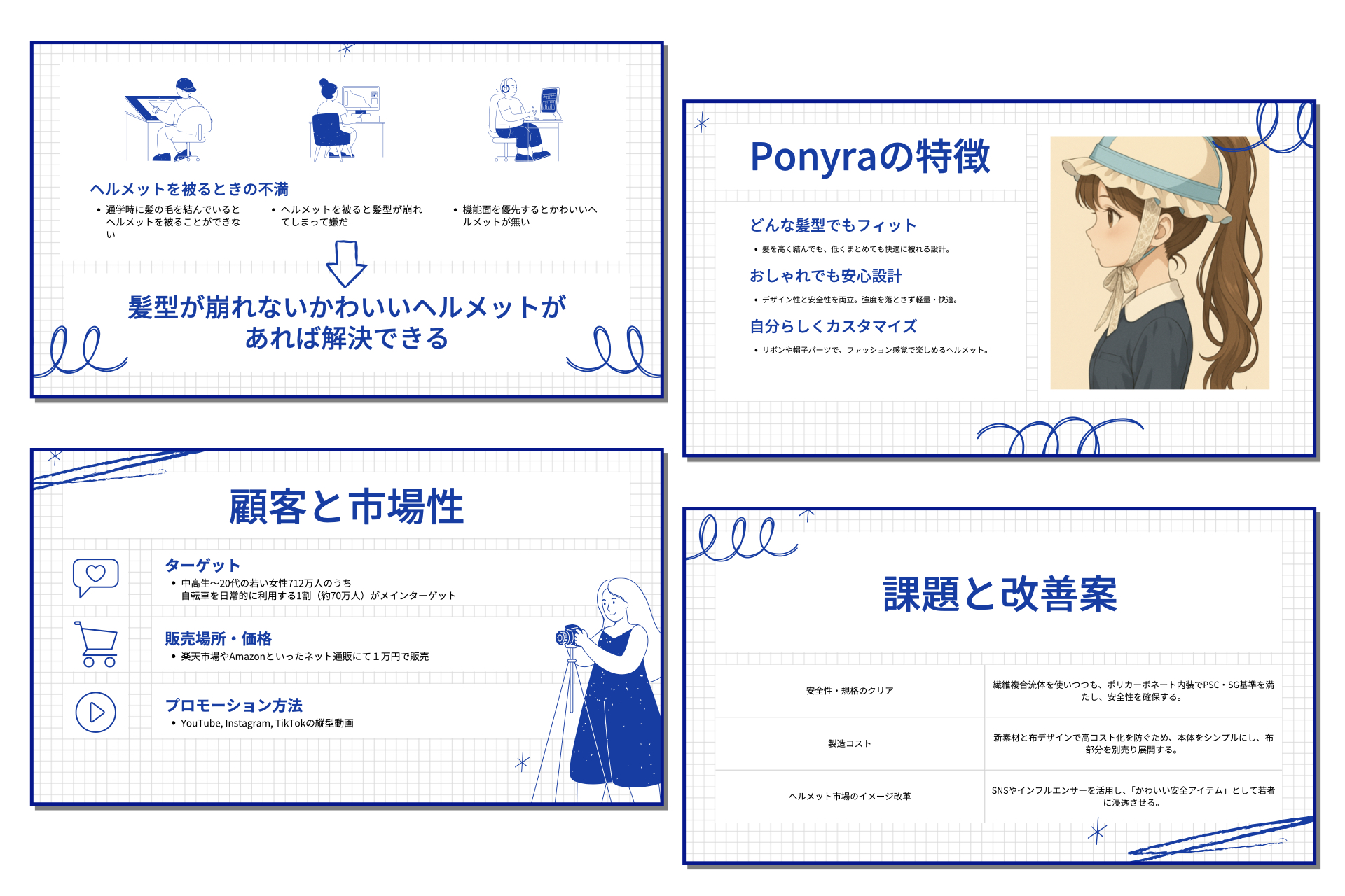 2人は探究活動の一環として取り組んでいる「ビジネス探究」に参加しており、今回のコンテストでは「ときめきと安心を両立する新しい時代のヘルメット『Ponyra(ポニラ)』」を発表し、見事なプレゼンテーションを行いました。