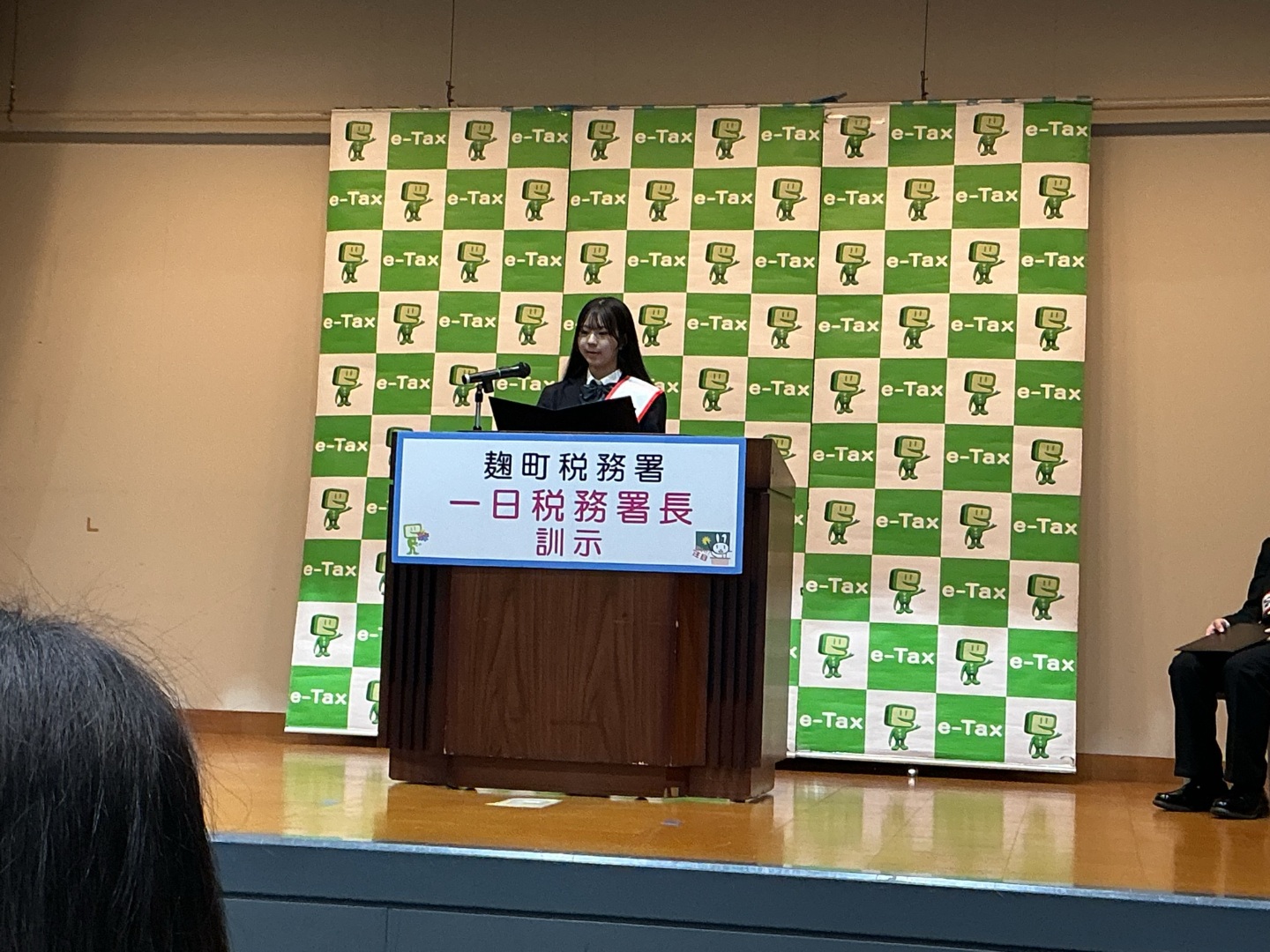 先日、麹町税務署で表彰式があり、受賞した生徒は「1日税務署長」の辞令をいただいて、名刺交換や各部署の「視察」などをおこないました。最後は、税務署の署員の方々を前に「署長訓示」として、受賞した作文を朗読しました。