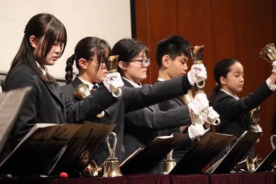 礼拝の途中では、ハンドベル部による演奏と女性アンサンブル部とともに讃美歌を合唱し、生徒全員で心を合わせてクリスマスをお祝いしました。