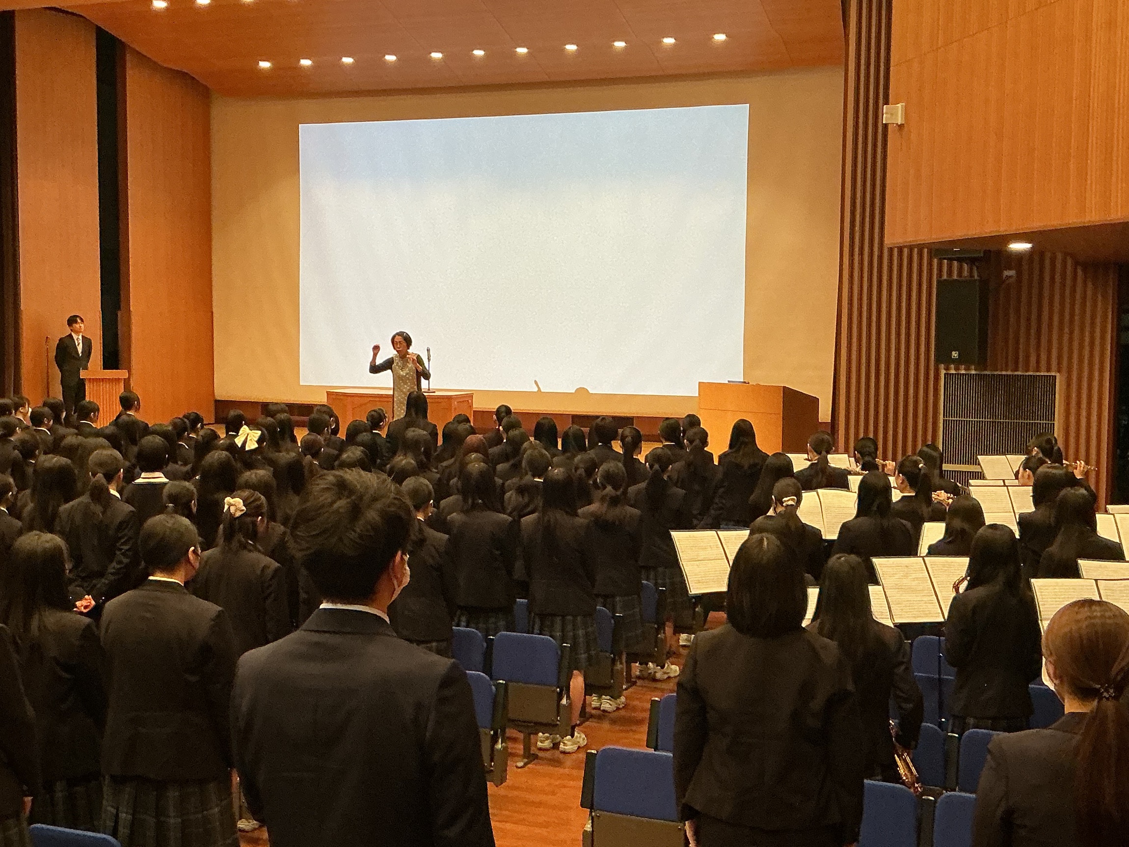 校長先生は自身のチャレンジとして生成AIの学校での活用の仕方を考えたそうです。自作の歌詞に生成AIによる曲をつけ、様々なことにチャレンジする全校生徒、特にこれから大学受験に挑む高3生に向けた歌のプレゼントがありました。