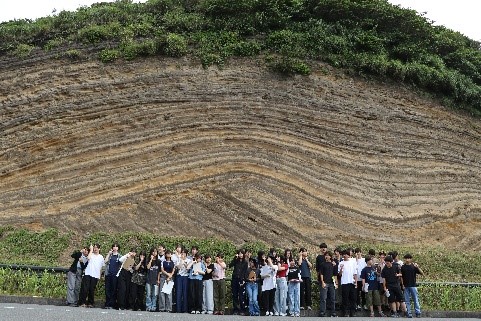 有名なバームクーヘン(地層大切断面)を見た生徒たちは、そのインパクトに驚きの声を上げていました。また、7月にリニューアルオープンしたばかりの伊豆大島ミュージアム-ジオノスでは、実物の火山噴出物や地層のはぎ取り標本の展示に触れることができ、さまざまな火山地形や植生遷移、大島の歴史などについて、最新の設備を通して学ぶことができました。