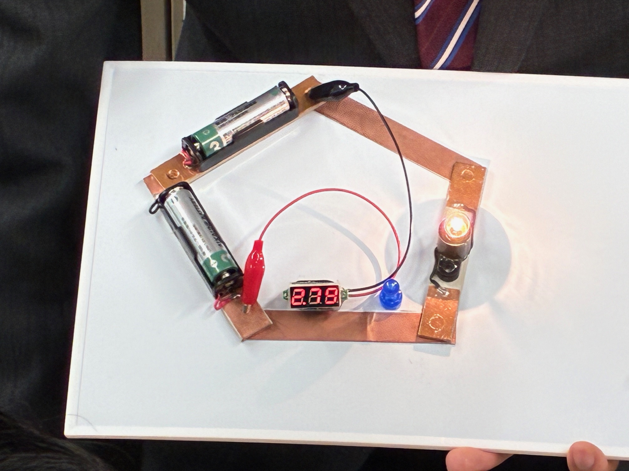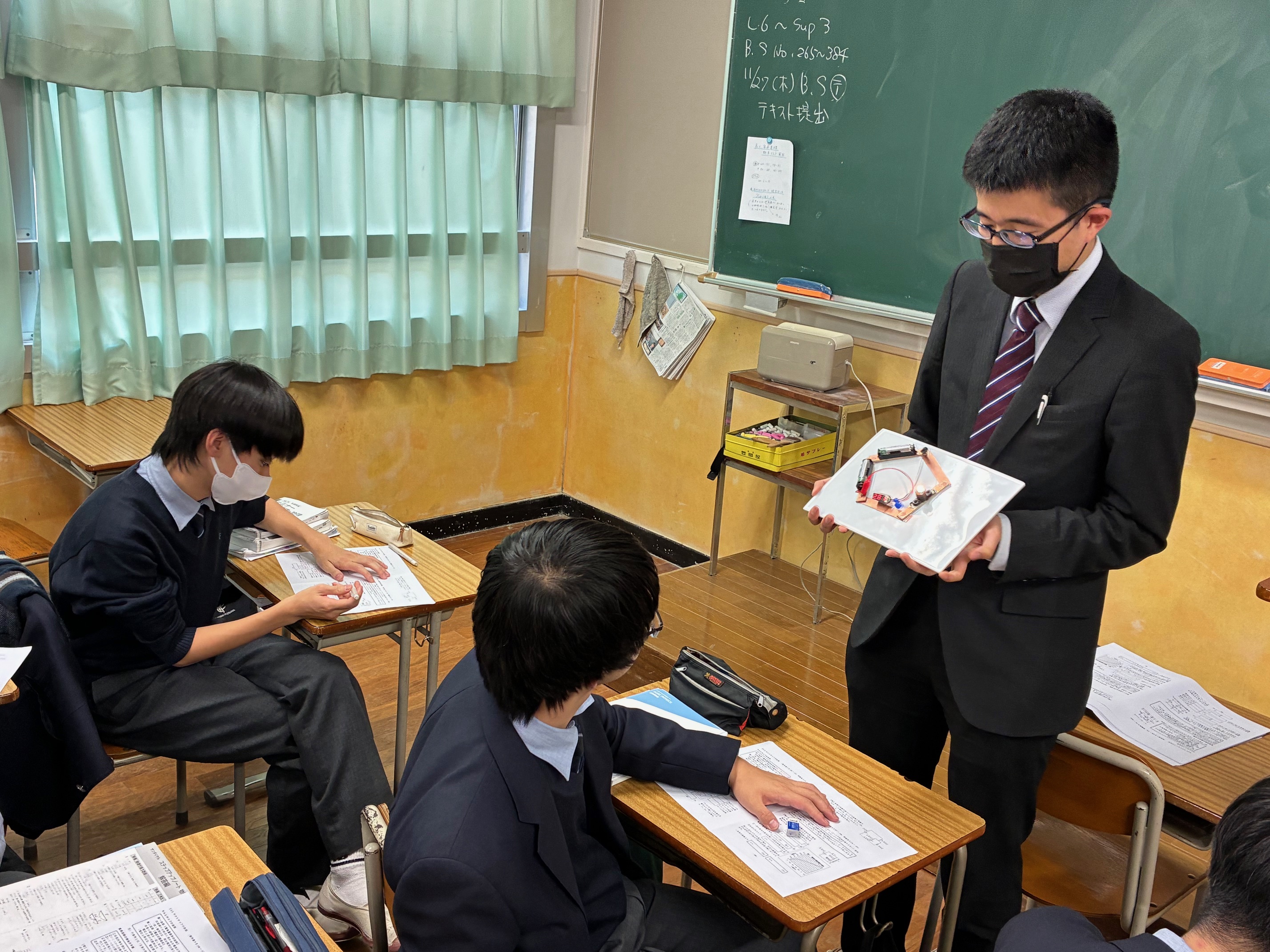 高校2年生を対象に、電流分野の「非直線抵抗」をテーマとした授業を行いました。豆電球の抵抗は、加える電圧によって明るさ(発熱量)が変化するため、その値も変わります。生徒はオームの法則から電圧と電流が比例関係にあると学びますが、実際には電球やダイオードのように、電流の大きさによって抵抗値が変化する素子も存在します。本授業では、手製のミニ電圧計・ミニ電流計を用いて、この抵抗の変化を実際に観察しました。