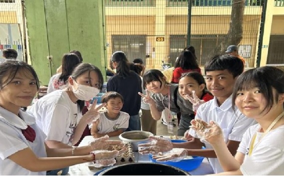 現地の小学校を訪問し、日本の文化を紹介する貴重な交流の時間を持ちました。児童たちの前で披露したソーラン節には大きな拍手が送られ、折り紙や手品にも笑顔があふれました。さらに、炊き出しを通じて現地の方々とのふれあいを深める機会もあり、生徒たちは準備や配膳に積極的に関わり、温かい食事を届けることで、心の交流を育みました。